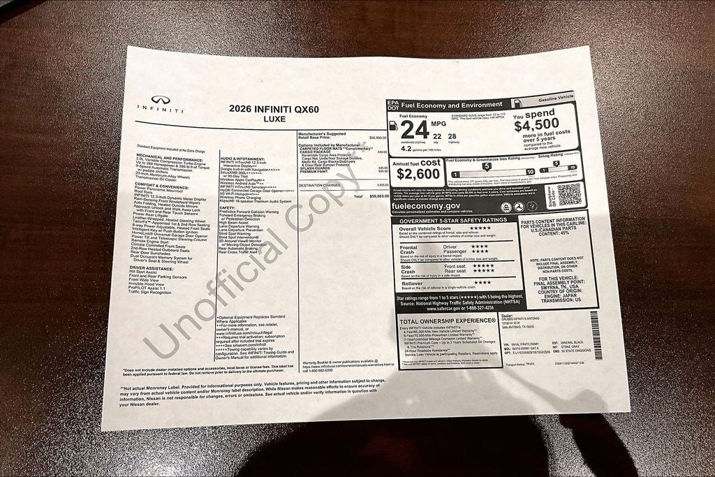Grubbs INFINITI of San Antonio The only Authorized INFINITI Dealer in San Antonio with the largest New and Pre-Owned INFINITI Selection in the area. This 2026 INFINITI QX60 LUXE comes with 3 Year INFINITI Recommended Maintenance Included at no charge and is loaded with the following Factory Options: Cargo Package (Cargo Blocks, Cargo Mat, Cargo Net, Clear Rear Bumper Film, and Medic Kit), 16 Speakers, 3rd row seats: bench, 4-Wheel Disc Brakes, ABS brakes, Air Conditioning, Alloy wheels, AM/FM radio: SiriusXM with 360L, Anti-whiplash front head restraints, Apple CarPlay/Android Auto, Auto High-beam Headlights, Auto tilt-away steering wheel, Auto-dimming door mirrors, Auto-dimming Rear-View mirror, Automatic temperature control, Bose Performance Series 17-Speaker Sound System, Brake assist, Bumpers: body-color, Climate Controlled Front Bucket Seats, Delay-off headlights, Driver door bin, Driver vanity mirror, Dual front impact airbags, Dual front side impact airbags, Electronic Stability Control, Emergency communication system: INFINITI InTouch, Four wheel independent suspension, Front anti-roll bar, Front Bucket Seats, Front Center Armrest, Front dual zone A/C, Front reading lights, Fully automatic headlights, Garage door transmitter: HomeLink, Heated door mirrors, Heated front seats, Heated rear seats, Heated steering wheel, Illuminated entry, Knee airbag, Leather Shift Knob, Leather steering wheel, Low tire pressure warning, Memory seat, Navigation system: Google Built-in, Occupant sensing airbag, Outside temperature display, Overhead airbag, Overhead console, Panic alarm, Passenger door bin, Passenger vanity mirror, Power door mirrors, Power driver seat, Power Liftgate, Power moonroof: Panoramic, Power passenger seat, Power steering, Power windows, Premium Paint, Radio data system, Radio: Klipsch Premium Audio System, Rain sensing wipers, Rear air conditioning, Rear anti-roll bar, Rear reading lights, Rear seat center armrest, Rear side impact airbag, Rear window defroster, Rear window wiper, Reclining 3rd row seat, Remote keyless entry, Security system, Speed control, Speed-sensing steering, Speed-Sensitive Wipers, Splash Guards, Split folding rear seat, Spoiler, Steering wheel memory, Steering wheel mounted audio controls, Tachometer, Tailorfit-Appointed Seating Surfaces, Telescoping steering wheel, Tilt steering wheel, Traction control, Trip computer, Turn signal indicator mirrors, Variably intermittent wipers, Ventilated front seats, and Wheels: 20 x 8J Machined Aluminum Alloy!! Priced below KBB Fair Purchase Price!