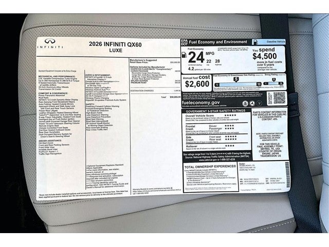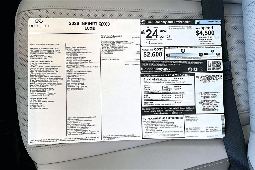 Grubbs INFINITI – The Only Authorized INFINITI Dealer in Grapevine Proudly serving drivers across the U.S. Since 1948! Explore one of the largest selections of New and Pre-Owned INFINITI vehicles in the area — all backed by our commitment to excellence and exceptional customer service. Every New Grubbs INFINITI comes with: Our Exclusive Lifetime Powertrain Warranty 3 Years of INFINITI-Recommended Maintenance – Included, with No Charge Valet Service when servicing your vehicle with pick up and drop at work or home and Hassle-Free Nationwide Shipping is Available. This 2026 INFINITI QX60 LUXE in Mineral Black with Premium Stone Gray interior is equipped with the following high value Features Cargo Package (Cargo Blocks, Cargo Mat, Cargo Net, Clear Rear Bumper Film, and Medic Kit), 16 Speakers, 3rd row seats: bench, 4-Wheel Disc Brakes, ABS brakes, Air Conditioning, Alloy wheels, AM/FM radio: SiriusXM with 360L, Anti-whiplash front head restraints, Apple CarPlay/Android Auto, Auto High-beam Headlights, Auto tilt-away steering wheel, Auto-dimming door mirrors, Auto-dimming Rear-View mirror, Automatic temperature control, Bose Performance Series 17-Speaker Sound System, Brake assist, Bumpers: body-color, Climate Controlled Front Bucket Seats, Delay-off headlights, Driver door bin, Driver vanity mirror, Dual front impact airbags, Dual front side impact airbags, Electronic Stability Control, Emergency communication system: INFINITI InTouch, Floor Mats with Bench Seats on 3rd Row Tray, Four wheel independent suspension, Front anti-roll bar, Front Bucket Seats, Front Center Armrest, Front dual zone A/C, Front reading lights, Fully automatic headlights, Garage door transmitter: HomeLink, Heated door mirrors, Heated front seats, Heated rear seats, Heated steering wheel, Illuminated entry, Knee airbag, Leather Shift Knob, Leather steering wheel, Literature Kit, Low tire pressure warning, Memory seat, Navigation system: Google Built-in, Occupant sensing airbag, Outside temperature display, Overhead airbag, Overhead console, Panic alarm, Passenger door bin, Passenger vanity mirror, Power door mirrors, Power driver seat, Power Liftgate, Power moonroof: Panoramic, Power passenger seat, Power steering, Power windows, Premium Paint, Radio data system, Radio: Klipsch Premium Audio System, Rain sensing wipers, Rear air conditioning, Rear anti-roll bar, Rear reading lights, Rear seat center armrest, Rear side impact airbag, Rear window defroster, Rear window wiper, Reclining 3rd row seat, Remote keyless entry, Security system, Speed control, Speed-sensing steering, Speed-Sensitive Wipers, Splash Guards, Split folding rear seat, Spoiler, Steering wheel memory, Steering wheel mounted audio controls, Tachometer, Tailorfit-Appointed Seating Surfaces, Telescoping steering wheel, Tilt steering wheel, Traction control, Trip computer, Turn signal indicator mirrors, Variably intermittent wipers, Ventilated front seats, and Wheels: 20 x 8J Machined Aluminum Alloy.