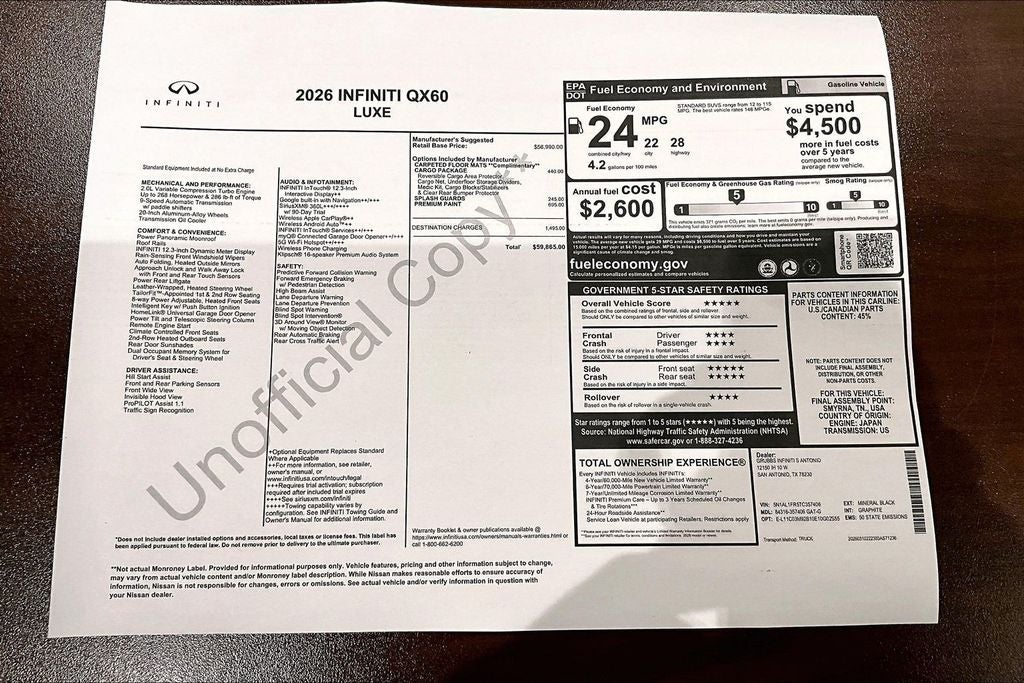 Grubbs INFINITI of San Antonio The only Authorized INFINITI Dealer in San Antonio with the largest New and Pre-Owned INFINITI Selection in the area. This 2026 INFINITI QX60 LUXE comes with 3 Year INFINITI Recommended Maintenance Included at no charge and is loaded with the following Factory Options: Cargo Package (Cargo Blocks, Cargo Mat, Cargo Net, Clear Rear Bumper Film, and Medic Kit), 16 Speakers, 3rd row seats: bench, 4-Wheel Disc Brakes, ABS brakes, Air Conditioning, Alloy wheels, AM/FM radio: SiriusXM with 360L, Anti-whiplash front head restraints, Apple CarPlay/Android Auto, Auto High-beam Headlights, Auto tilt-away steering wheel, Auto-dimming door mirrors, Auto-dimming Rear-View mirror, Automatic temperature control, Bose Performance Series 17-Speaker Sound System, Brake assist, Bumpers: body-color, Climate Controlled Front Bucket Seats, Delay-off headlights, Driver door bin, Driver vanity mirror, Dual front impact airbags, Dual front side impact airbags, Electronic Stability Control, Emergency communication system: INFINITI InTouch, Four wheel independent suspension, Front anti-roll bar, Front Bucket Seats, Front Center Armrest, Front dual zone A/C, Front reading lights, Fully automatic headlights, Garage door transmitter: HomeLink, Heated door mirrors, Heated front seats, Heated rear seats, Heated steering wheel, Illuminated entry, Knee airbag, Leather Shift Knob, Leather steering wheel, Low tire pressure warning, Memory seat, Navigation system: Google Built-in, Occupant sensing airbag, Outside temperature display, Overhead airbag, Overhead console, Panic alarm, Passenger door bin, Passenger vanity mirror, Power door mirrors, Power driver seat, Power Liftgate, Power moonroof: Panoramic, Power passenger seat, Power steering, Power windows, Premium Paint, Radio data system, Radio: Klipsch Premium Audio System, Rain sensing wipers, Rear air conditioning, Rear anti-roll bar, Rear reading lights, Rear seat center armrest, Rear side impact airbag, Rear window defroster, Rear window wiper, Reclining 3rd row seat, Remote keyless entry, Security system, Speed control, Speed-sensing steering, Speed-Sensitive Wipers, Splash Guards, Split folding rear seat, Spoiler, Steering wheel memory, Steering wheel mounted audio controls, Tachometer, Tailorfit-Appointed Seating Surfaces, Telescoping steering wheel, Tilt steering wheel, Traction control, Trip computer, Turn signal indicator mirrors, Variably intermittent wipers, Ventilated front seats, and Wheels: 20 x 8J Machined Aluminum Alloy!! Priced below KBB Fair Purchase Price!