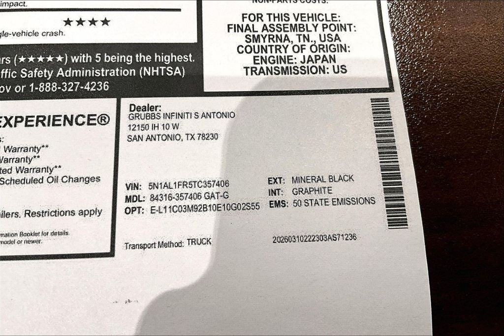 Contact us now to find out why so many customers from across the US rely on Grubbs INFINITI of San Antonio, a family owned business since 1948, to meet their automotive needs! Outside of San Antonio area, no problem, we offer: Reliable, affordable and fast shipping options Nationwide- Our shipping partners are licensed, bonded, fully insured & experienced with high-end vehicles. Hassle free and competitive financing options - Let us leverage our relationships with leading Banks & Credit Unions to get you the lowest rates and best terms for all credit types. Whether you're shopping for a new INFINITI or a quality used pre-owned vehicle you'll receive the same first-class experience from our certified staff of factory trained specialists. Call us today 210-728-3486 or visit us at www.INFINITIofsanantonio.com. .$5000 - Retail Cash. Exp. 05/04/2026 Price excludes $1995 of dealer added accessories.