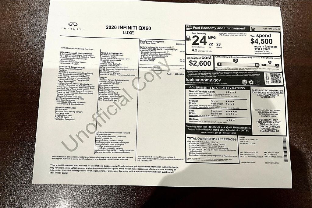 Grubbs INFINITI of San Antonio The only Authorized INFINITI Dealer in San Antonio with the largest New and Pre-Owned INFINITI Selection in the area. This 2026 INFINITI QX60 LUXE comes with 3 Year INFINITI Recommended Maintenance Included at no charge and is loaded with the following Factory Options: Cargo Package (Cargo Blocks, Cargo Mat, Cargo Net, Clear Rear Bumper Film, and Medic Kit), 16 Speakers, 3rd row seats: bench, 4-Wheel Disc Brakes, ABS brakes, Air Conditioning, Alloy wheels, AM/FM radio: SiriusXM with 360L, Anti-whiplash front head restraints, Apple CarPlay/Android Auto, Auto High-beam Headlights, Auto tilt-away steering wheel, Auto-dimming door mirrors, Auto-dimming Rear-View mirror, Automatic temperature control, Bose Performance Series 17-Speaker Sound System, Brake assist, Bumpers: body-color, Climate Controlled Front Bucket Seats, Delay-off headlights, Driver door bin, Driver vanity mirror, Dual front impact airbags, Dual front side impact airbags, Electronic Stability Control, Emergency communication system: INFINITI InTouch, Four wheel independent suspension, Front anti-roll bar, Front Bucket Seats, Front Center Armrest, Front dual zone A/C, Front reading lights, Fully automatic headlights, Garage door transmitter: HomeLink, Heated door mirrors, Heated front seats, Heated rear seats, Heated steering wheel, Illuminated entry, Knee airbag, Leather Shift Knob, Leather steering wheel, Low tire pressure warning, Memory seat, Navigation system: Google Built-in, Occupant sensing airbag, Outside temperature display, Overhead airbag, Overhead console, Panic alarm, Passenger door bin, Passenger vanity mirror, Power door mirrors, Power driver seat, Power Liftgate, Power moonroof: Panoramic, Power passenger seat, Power steering, Power windows, Premium Paint, Radio data system, Radio: Klipsch Premium Audio System, Rain sensing wipers, Rear air conditioning, Rear anti-roll bar, Rear reading lights, Rear seat center armrest, Rear side impact airbag, Rear window defroster, Rear window wiper, Reclining 3rd row seat, Remote keyless entry, Security system, Speed control, Speed-sensing steering, Speed-Sensitive Wipers, Splash Guards, Split folding rear seat, Spoiler, Steering wheel memory, Steering wheel mounted audio controls, Tachometer, Tailorfit-Appointed Seating Surfaces, Telescoping steering wheel, Tilt steering wheel, Traction control, Trip computer, Turn signal indicator mirrors, Variably intermittent wipers, Ventilated front seats, and Wheels: 20 x 8J Machined Aluminum Alloy!! Priced below KBB Fair Purchase Price!