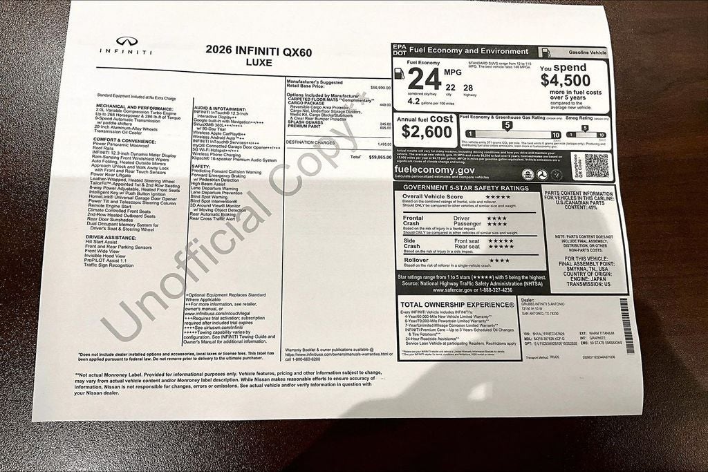 Grubbs INFINITI of San Antonio The only Authorized INFINITI Dealer in San Antonio with the largest New and Pre-Owned INFINITI Selection in the area. This 2026 INFINITI QX60 LUXE comes with 3 Year INFINITI Recommended Maintenance Included at no charge and is loaded with the following Factory Options: Cargo Package (Cargo Blocks, Cargo Mat, Cargo Net, Clear Rear Bumper Film, and Medic Kit), 16 Speakers, 3rd row seats: bench, 4-Wheel Disc Brakes, ABS brakes, Air Conditioning, Alloy wheels, AM/FM radio: SiriusXM with 360L, Anti-whiplash front head restraints, Apple CarPlay/Android Auto, Auto High-beam Headlights, Auto tilt-away steering wheel, Auto-dimming door mirrors, Auto-dimming Rear-View mirror, Automatic temperature control, Bose Performance Series 17-Speaker Sound System, Brake assist, Bumpers: body-color, Climate Controlled Front Bucket Seats, Delay-off headlights, Driver door bin, Driver vanity mirror, Dual front impact airbags, Dual front side impact airbags, Electronic Stability Control, Emergency communication system: INFINITI InTouch, Four wheel independent suspension, Front anti-roll bar, Front Bucket Seats, Front Center Armrest, Front dual zone A/C, Front reading lights, Fully automatic headlights, Garage door transmitter: HomeLink, Heated door mirrors, Heated front seats, Heated rear seats, Heated steering wheel, Illuminated entry, Knee airbag, Leather Shift Knob, Leather steering wheel, Low tire pressure warning, Memory seat, Navigation system: Google Built-in, Occupant sensing airbag, Outside temperature display, Overhead airbag, Overhead console, Panic alarm, Passenger door bin, Passenger vanity mirror, Power door mirrors, Power driver seat, Power Liftgate, Power moonroof: Panoramic, Power passenger seat, Power steering, Power windows, Premium Paint, Radio data system, Radio: Klipsch Premium Audio System, Rain sensing wipers, Rear air conditioning, Rear anti-roll bar, Rear reading lights, Rear seat center armrest, Rear side impact airbag, Rear window defroster, Rear window wiper, Reclining 3rd row seat, Remote keyless entry, Security system, Speed control, Speed-sensing steering, Speed-Sensitive Wipers, Splash Guards, Split folding rear seat, Spoiler, Steering wheel memory, Steering wheel mounted audio controls, Tachometer, Tailorfit-Appointed Seating Surfaces, Telescoping steering wheel, Tilt steering wheel, Traction control, Trip computer, Turn signal indicator mirrors, Variably intermittent wipers, Ventilated front seats, and Wheels: 20 x 8J Machined Aluminum Alloy!! Priced below KBB Fair Purchase Price!