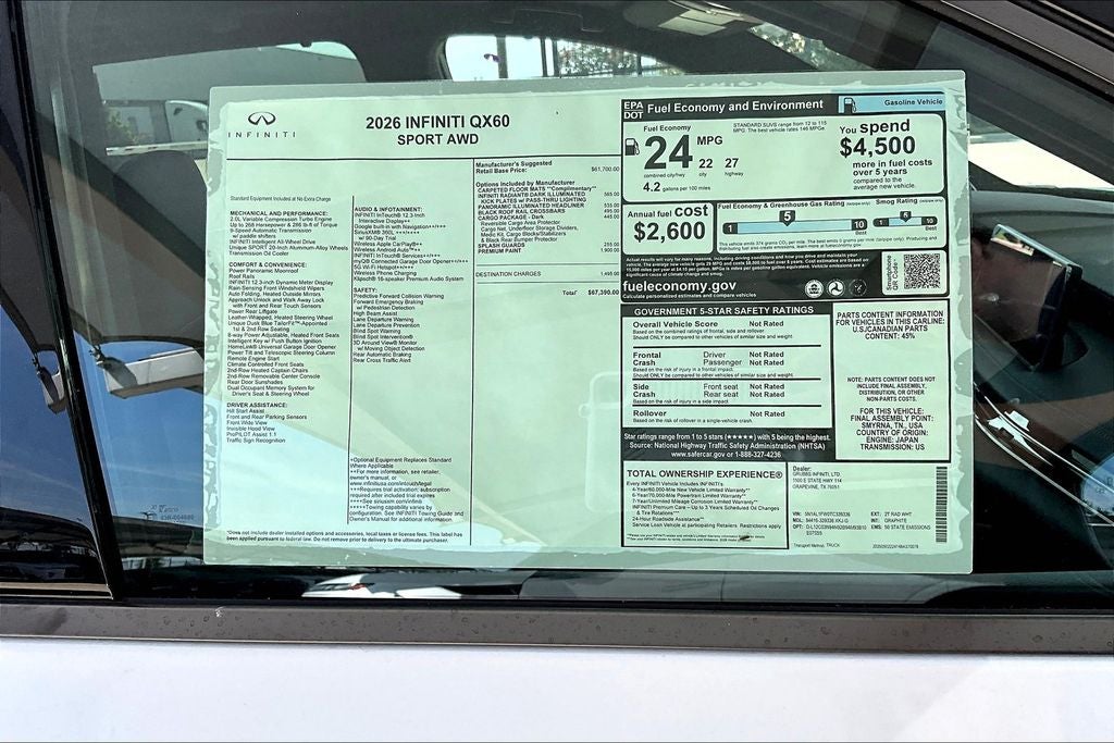 Whether you're searching for a reliable used truck, a spacious SUV, or a fuel-efficient pre-owned car, this 2026 QX60 offers the performance, value, and peace of mind you deserve. Contact us now to find out why so many customers from across the US rely on Grubbs INFINITI of Grapevine, a family-owned business since 1948, to meet their automotive needs! Outside of Metroplex area, no problem, we offer: Reliable, affordable and fast shipping options Nationwide - Our shipping partners are licensed, bonded, fully insured & experienced with high-end vehicles. Hassle free and competitive financing options - Let us leverage our relationships with leading Banks & Credit Unions to get you the lowest rates and best terms for all credit types. Whether you're shopping for a New or Certified INFINITI or a quality used Pre-Owned Toyota, Ford. Chevy, Lexus, Mercedes, BMW, Nissan, Honda, or Tesla vehicle you'll receive the same first-class experience from our certified staff of factory trained specialists. Grubbs INFINITI proudly serves the following communities: Grapevine, Dallas, Ft. Worth, Richardson, Plano, Carrollton, DFW, Austin, Bedford, Arlington, Denton, Keller, Southlake, Lewisville, and Prosper. Call us today at 817-527-8103 or visit us at www.grubbsINFINITI.com/ Price includes: $6000 - Retail Cash. Exp. 03/31/2026