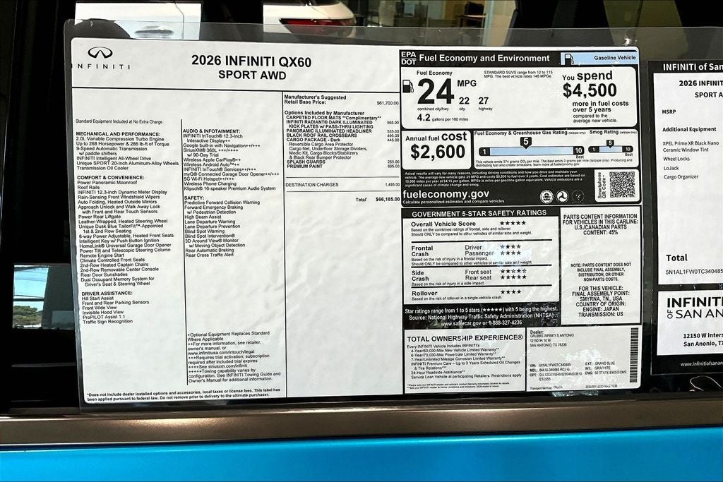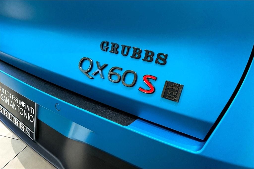 Grubbs INFINITI of San Antonio The only Authorized INFINITI Dealer in San Antonio with the largest New and Pre-Owned INFINITI Selection in the area. This 2026 INFINITI QX60 SPORT comes with 3 Year INFINITI Recommended Maintenance Included at no charge and is loaded with the following Factory Options: Dark Cargo Package (Black Rear Bumper Film, Cargo Blocks, Cargo Mat, Cargo Net, and Medic Kit), 17 Speakers, 3rd row seats: bench, 4-Wheel Disc Brakes, ABS brakes, Air Conditioning, Alloy wheels, AM/FM radio: SiriusXM with 360L, Anti-whiplash front head restraints, Apple CarPlay/Android Auto, Auto High-beam Headlights, Auto tilt-away steering wheel, Auto-dimming door mirrors, Auto-dimming Rear-View mirror, Automatic temperature control, Black Roof Rail Crossbars, Bose Performance Series 17-Speaker Sound System, Brake assist, Bumpers: body-color, Climate Controlled Front Bucket Seats, Delay-off headlights, Driver door bin, Driver vanity mirror, Dual front impact airbags, Dual front side impact airbags, Electronic Stability Control, Emergency communication system: INFINITI InTouch, Four wheel independent suspension, Front anti-roll bar, Front Bucket Seats, Front Center Armrest, Front dual zone A/C, Front reading lights, Fully automatic headlights, Garage door transmitter: HomeLink, Genuine wood door panel insert, Heated door mirrors, Heated front seats, Heated rear seats, Heated steering wheel, Illuminated entry, INFINITI Radiant Dark Illuminated Kick Plates, Knee airbag, Leather Shift Knob, Leather steering wheel, Low tire pressure warning, Memory seat, Navigation system: Google Built-in, Occupant sensing airbag, Outside temperature display, Overhead airbag, Overhead console, Panic alarm, Panoramic Illuminated Headliner, Passenger door bin, Passenger vanity mirror, Power door mirrors, Power driver seat, Power Liftgate, Power moonroof: Panoramic, Power passenger seat, Power steering, Power windows, Premium Paint, Radio data system, Radio: Klipsch Premium Audio System, Rain sensing wipers, Rear air conditioning, Rear anti-roll bar, Rear reading lights, Rear side impact airbag, Rear window defroster, Rear window wiper, Reclining 3rd row seat, Remote keyless entry, Security system, Speed control, Speed-sensing steering, Speed-Sensitive Wipers, Splash Guards, Split folding rear seat, Spoiler, Steering wheel memory, Steering wheel mounted audio controls, Tachometer, Telescoping steering wheel, Tilt steering wheel, Traction control, Trip computer, Turn signal indicator mirrors, Variably intermittent wipers, and Ventilated front seats!! Priced below KBB Fair Purchase Price!