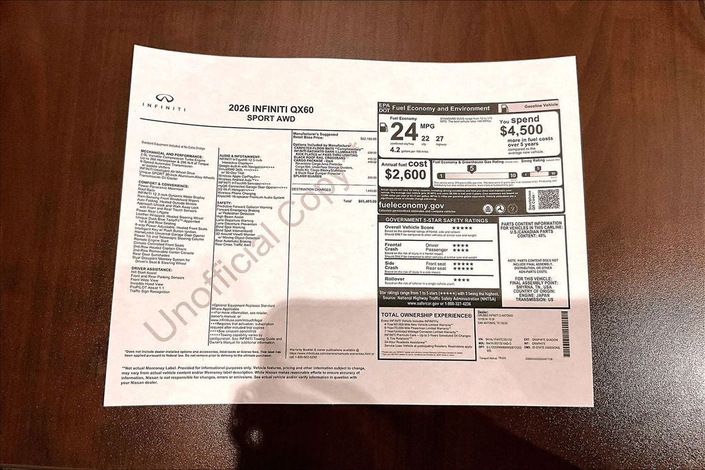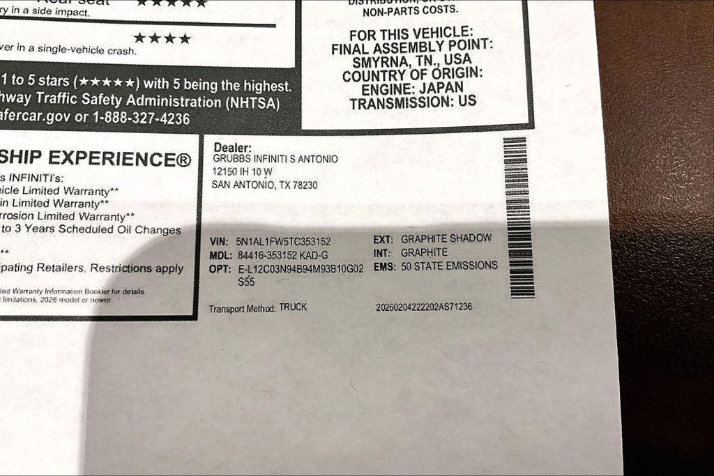 Grubbs INFINITI of San Antonio The only Authorized INFINITI Dealer in San Antonio with the largest New and Pre-Owned INFINITI Selection in the area. This 2026 INFINITI QX60 SPORT comes with 3 Year INFINITI Recommended Maintenance Included at no charge and is loaded with the following Factory Options: Dark Cargo Package (Black Rear Bumper Film, Cargo Blocks, Cargo Mat, and Medic Kit), 17 Speakers, 3rd row seats: bench, 4-Wheel Disc Brakes, ABS brakes, Air Conditioning, Alloy wheels, AM/FM radio: SiriusXM with 360L, Anti-whiplash front head restraints, Apple CarPlay/Android Auto, Auto High-beam Headlights, Auto tilt-away steering wheel, Auto-dimming door mirrors, Auto-dimming Rear-View mirror, Automatic temperature control, Black Roof Rail Crossbars, Bose Performance Series 17-Speaker Sound System, Brake assist, Bumpers: body-color, Climate Controlled Front Bucket Seats, Delay-off headlights, Driver door bin, Driver vanity mirror, Dual front impact airbags, Dual front side impact airbags, Electronic Stability Control, Emergency communication system: INFINITI InTouch, Four wheel independent suspension, Front anti-roll bar, Front Bucket Seats, Front Center Armrest, Front dual zone A/C, Front reading lights, Fully automatic headlights, Garage door transmitter: HomeLink, Genuine wood door panel insert, Heated door mirrors, Heated front seats, Heated rear seats, Heated steering wheel, Illuminated entry, INFINITI Radiant Dark Illuminated Kick Plates, Knee airbag, Leather Shift Knob, Leather steering wheel, Low tire pressure warning, Memory seat, Navigation system: Google Built-in, Occupant sensing airbag, Outside temperature display, Overhead airbag, Overhead console, Panic alarm, Passenger door bin, Passenger vanity mirror, Power door mirrors, Power driver seat, Power Liftgate, Power moonroof: Panoramic, Power passenger seat, Power steering, Power windows, Radio data system, Radio: Klipsch Premium Audio System, Rain sensing wipers, Rear air conditioning, Rear anti-roll bar, Rear reading lights, Rear side impact airbag, Rear window defroster, Rear window wiper, Reclining 3rd row seat, Remote keyless entry, Security system, Speed control, Speed-sensing steering, Speed-Sensitive Wipers, Splash Guards, Split folding rear seat, Spoiler, Steering wheel memory, Steering wheel mounted audio controls, Tachometer, Tailorfit-Appointed Seating Surfaces, Telescoping steering wheel, Tilt steering wheel, Traction control, Trip computer, Turn signal indicator mirrors, Variably intermittent wipers, Ventilated front seats, and Wheels: 20 x 8J Unique Sporty Machined Aluminum Alloy!! Priced below KBB Fair Purchase Price!