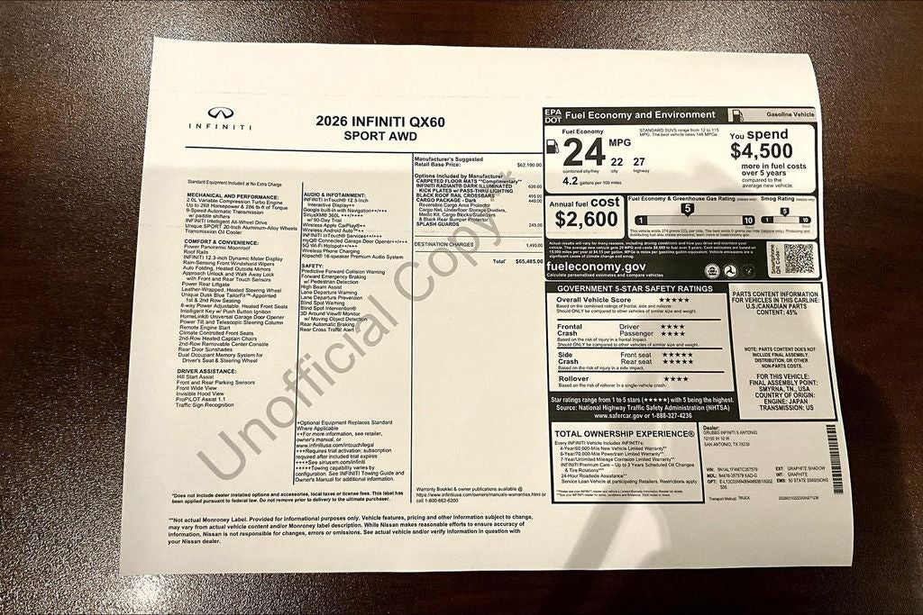 Grubbs INFINITI of San Antonio The only Authorized INFINITI Dealer in San Antonio with the largest New and Pre-Owned INFINITI Selection in the area. This 2026 INFINITI QX60 SPORT comes with 3 Year INFINITI Recommended Maintenance Included at no charge and is loaded with the following Factory Options: Dark Cargo Package (Black Rear Bumper Film, Cargo Blocks, Cargo Mat, and Medic Kit), 17 Speakers, 3rd row seats: bench, 4-Wheel Disc Brakes, ABS brakes, Air Conditioning, Alloy wheels, AM/FM radio: SiriusXM with 360L, Anti-whiplash front head restraints, Apple CarPlay/Android Auto, Auto High-beam Headlights, Auto tilt-away steering wheel, Auto-dimming door mirrors, Auto-dimming Rear-View mirror, Automatic temperature control, Black Roof Rail Crossbars, Bose Performance Series 17-Speaker Sound System, Brake assist, Bumpers: body-color, Climate Controlled Front Bucket Seats, Delay-off headlights, Driver door bin, Driver vanity mirror, Dual front impact airbags, Dual front side impact airbags, Electronic Stability Control, Emergency communication system: INFINITI InTouch, Four wheel independent suspension, Front anti-roll bar, Front Bucket Seats, Front Center Armrest, Front dual zone A/C, Front reading lights, Fully automatic headlights, Garage door transmitter: HomeLink, Genuine wood door panel insert, Heated door mirrors, Heated front seats, Heated rear seats, Heated steering wheel, Illuminated entry, INFINITI Radiant Dark Illuminated Kick Plates, Knee airbag, Leather Shift Knob, Leather steering wheel, Low tire pressure warning, Memory seat, Navigation system: Google Built-in, Occupant sensing airbag, Outside temperature display, Overhead airbag, Overhead console, Panic alarm, Passenger door bin, Passenger vanity mirror, Power door mirrors, Power driver seat, Power Liftgate, Power moonroof: Panoramic, Power passenger seat, Power steering, Power windows, Radio data system, Radio: Klipsch Premium Audio System, Rain sensing wipers, Rear air conditioning, Rear anti-roll bar, Rear reading lights, Rear side impact airbag, Rear window defroster, Rear window wiper, Reclining 3rd row seat, Remote keyless entry, Security system, Speed control, Speed-sensing steering, Speed-Sensitive Wipers, Splash Guards, Split folding rear seat, Spoiler, Steering wheel memory, Steering wheel mounted audio controls, Tachometer, Tailorfit-Appointed Seating Surfaces, Telescoping steering wheel, Tilt steering wheel, Traction control, Trip computer, Turn signal indicator mirrors, Variably intermittent wipers, Ventilated front seats, and Wheels: 20 x 8J Unique Sporty Machined Aluminum Alloy!! Priced below KBB Fair Purchase Price!