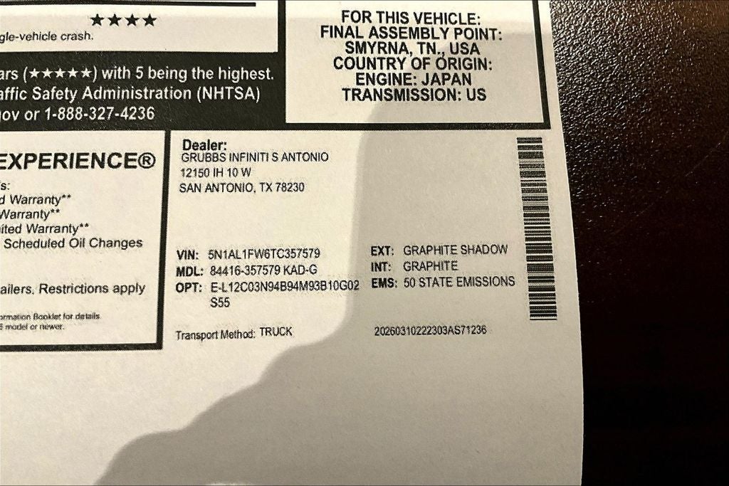 Contact us now to find out why so many customers from across the US rely on Grubbs INFINITI of San Antonio, a family owned business since 1948, to meet their automotive needs! Outside of San Antonio area, no problem, we offer: Reliable, affordable and fast shipping options Nationwide- Our shipping partners are licensed, bonded, fully insured & experienced with high-end vehicles. Hassle free and competitive financing options - Let us leverage our relationships with leading Banks & Credit Unions to get you the lowest rates and best terms for all credit types. Whether you're shopping for a new INFINITI or a quality used pre-owned vehicle you'll receive the same first-class experience from our certified staff of factory trained specialists. Call us today 210-728-3486 or visit us at www.INFINITIofsanantonio.com. .$6000 - Retail Cash. Exp. 05/04/2026 Price excludes $1995 of dealer added accessories.