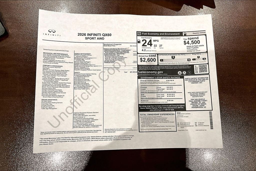 Grubbs INFINITI of San Antonio The only Authorized INFINITI Dealer in San Antonio with the largest New and Pre-Owned INFINITI Selection in the area. This 2026 INFINITI QX60 SPORT comes with 3 Year INFINITI Recommended Maintenance Included at no charge and is loaded with the following Factory Options: Dark Cargo Package (Black Rear Bumper Film, Cargo Blocks, Cargo Mat, and Medic Kit), 17 Speakers, 2-Tone Super Premium Paint, 3rd row seats: bench, 4-Wheel Disc Brakes, ABS brakes, Air Conditioning, Alloy wheels, AM/FM radio: SiriusXM with 360L, Anti-whiplash front head restraints, Apple CarPlay/Android Auto, Auto High-beam Headlights, Auto tilt-away steering wheel, Auto-dimming door mirrors, Auto-dimming Rear-View mirror, Automatic temperature control, Black Roof Rail Crossbars, Bose Performance Series 17-Speaker Sound System, Brake assist, Bumpers: body-color, Climate Controlled Front Bucket Seats, Delay-off headlights, Driver door bin, Driver vanity mirror, Dual front impact airbags, Dual front side impact airbags, Electronic Stability Control, Emergency communication system: INFINITI InTouch, Four wheel independent suspension, Front anti-roll bar, Front Bucket Seats, Front Center Armrest, Front dual zone A/C, Front reading lights, Fully automatic headlights, Garage door transmitter: HomeLink, Genuine wood door panel insert, Heated door mirrors, Heated front seats, Heated rear seats, Heated steering wheel, Illuminated entry, INFINITI Radiant Dark Illuminated Kick Plates, Knee airbag, Leather Shift Knob, Leather steering wheel, Low tire pressure warning, Memory seat, Navigation system: Google Built-in, Occupant sensing airbag, Outside temperature display, Overhead airbag, Overhead console, Panic alarm, Passenger door bin, Passenger vanity mirror, Power door mirrors, Power driver seat, Power Liftgate, Power moonroof: Panoramic, Power passenger seat, Power steering, Power windows, Radio data system, Radio: Klipsch Premium Audio System, Rain sensing wipers, Rear air conditioning, Rear anti-roll bar, Rear reading lights, Rear side impact airbag, Rear window defroster, Rear window wiper, Reclining 3rd row seat, Remote keyless entry, Security system, Speed control, Speed-sensing steering, Speed-Sensitive Wipers, Splash Guards, Split folding rear seat, Spoiler, Steering wheel memory, Steering wheel mounted audio controls, Tachometer, Tailorfit-Appointed Seating Surfaces, Telescoping steering wheel, Tilt steering wheel, Traction control, Trip computer, Turn signal indicator mirrors, Variably intermittent wipers, Ventilated front seats, and Wheels: 20 x 8J Unique Sporty Machined Aluminum Alloy!! Priced below KBB Fair Purchase Price!