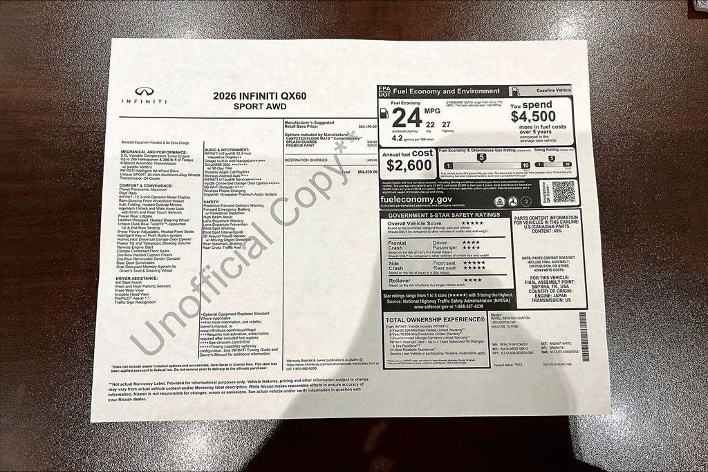 Grubbs INFINITI of San Antonio The only Authorized INFINITI Dealer in San Antonio with the largest New and Pre-Owned INFINITI Selection in the area. This 2026 INFINITI QX60 SPORT comes with 3 Year INFINITI Recommended Maintenance Included at no charge and is loaded with the following Factory Options: 17 Speakers, 3rd row seats: bench, 4-Wheel Disc Brakes, ABS brakes, Air Conditioning, Alloy wheels, AM/FM radio: SiriusXM with 360L, Anti-whiplash front head restraints, Apple CarPlay/Android Auto, Auto High-beam Headlights, Auto tilt-away steering wheel, Auto-dimming door mirrors, Auto-dimming Rear-View mirror, Automatic temperature control, Bose Performance Series 17-Speaker Sound System, Brake assist, Bumpers: body-color, Climate Controlled Front Bucket Seats, Delay-off headlights, Driver door bin, Driver vanity mirror, Dual front impact airbags, Dual front side impact airbags, Electronic Stability Control, Emergency communication system: INFINITI InTouch, Four wheel independent suspension, Front anti-roll bar, Front Bucket Seats, Front Center Armrest, Front dual zone A/C, Front reading lights, Fully automatic headlights, Garage door transmitter: HomeLink, Genuine wood door panel insert, Heated door mirrors, Heated front seats, Heated rear seats, Heated steering wheel, Illuminated entry, Knee airbag, Leather Shift Knob, Leather steering wheel, Low tire pressure warning, Memory seat, Navigation system: Google Built-in, Occupant sensing airbag, Outside temperature display, Overhead airbag, Overhead console, Panic alarm, Passenger door bin, Passenger vanity mirror, Power door mirrors, Power driver seat, Power Liftgate, Power moonroof: Panoramic, Power passenger seat, Power steering, Power windows, Radio data system, Radio: Klipsch Premium Audio System, Rain sensing wipers, Rear air conditioning, Rear anti-roll bar, Rear reading lights, Rear side impact airbag, Rear window defroster, Rear window wiper, Reclining 3rd row seat, Remote keyless entry, Security system, Speed control, Speed-sensing steering, Speed-Sensitive Wipers, Split folding rear seat, Spoiler, Steering wheel memory, Steering wheel mounted audio controls, Tachometer, Tailorfit-Appointed Seating Surfaces, Telescoping steering wheel, Tilt steering wheel, Traction control, Trip computer, Turn signal indicator mirrors, Variably intermittent wipers, Ventilated front seats, and Wheels: 20 x 8J Unique Sporty Machined Aluminum Alloy!! Priced below KBB Fair Purchase Price!