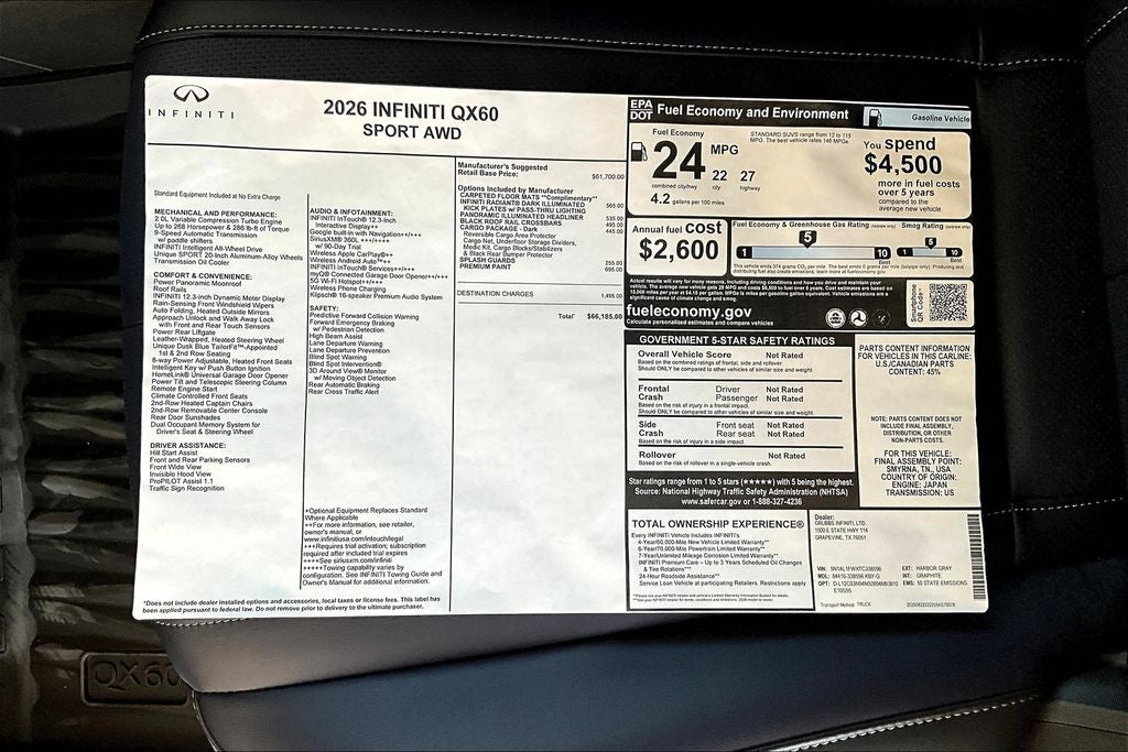 Grubbs INFINITI – The Only Authorized INFINITI Dealer in Grapevine Proudly serving drivers across the U.S. Since 1948! Explore one of the largest selections of New and Pre-Owned INFINITI vehicles in the area — all backed by our commitment to excellence and exceptional customer service. Every New Grubbs INFINITI comes with: Our Exclusive Lifetime Powertrain Warranty 3 Years of INFINITI-Recommended Maintenance – Included, with No Charge Valet Service when servicing your vehicle with pick up and drop at work or home and Hassle-Free Nationwide Shipping is Available. This 2026 INFINITI QX60 SPORT in Harbor Gray with Premium Graphite interior comes equipped with the following high value Features.