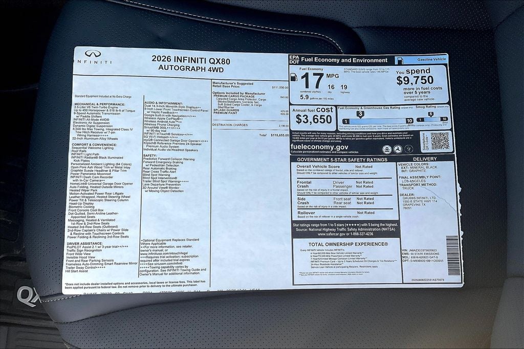 Grubbs INFINITI – The Only Authorized INFINITI Dealer in Grapevine Proudly serving drivers across the U.S. Since 1948! Explore one of the largest selections of New and Pre-Owned INFINITI vehicles in the area — all backed by our commitment to excellence and exceptional customer service. Every New Grubbs INFINITI comes with: Our Exclusive Lifetime Powertrain Warranty 3 Years of INFINITI-Recommended Maintenance – Included at No Charge Valet Service when servicing your vehicle with pick up and drop at work or home Hassle-Free Nationwide Shipping Available This 2026 INFINITI QX80 AUTOGRAPH in Mineral Black with Graphite interior comes equipped with the following high value Features Premium Cargo Package (Cargo Blocks/Stabilizers, Cargo Shelf/Barrier, Carpeted Cargo Area Protector, Console Net, and Soft-Sided Cargo Cooler), Apple CarPlay/Android Auto, Auto-leveling suspension, Fully automatic headlights, Heated front seats, Heated rear seats, HVAC memory, Navigation system: Google Built-in, Power Liftgate, Power moonroof, Radio: Klipsch Reference Premiere Audio System, Rain sensing wipers, Security system, Semi-Aniline Premium Leather Seating Surfaces, Ventilated front seats, and Wheels: 22 x 8.5J Cast Aluminum-Alloy.