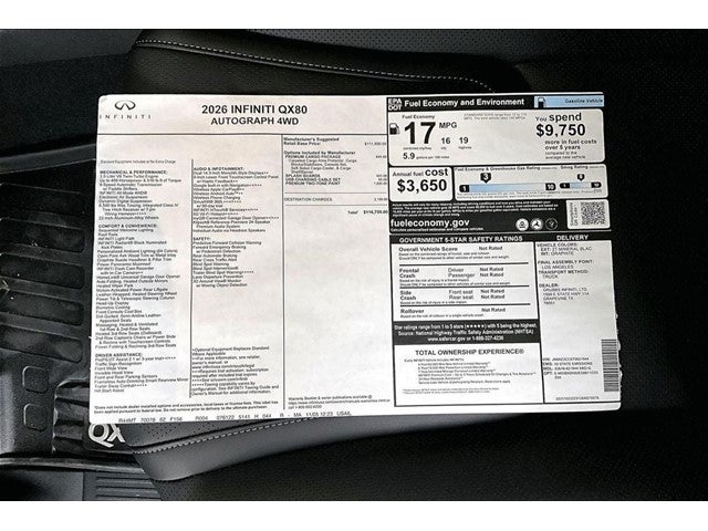 Grubbs INFINITI – The Only Authorized INFINITI Dealer in Grapevine Proudly serving drivers across the U.S. Since 1948! Explore one of the largest selections of New and Pre-Owned INFINITI vehicles in the area — all backed by our commitment to excellence and exceptional customer service. Every New Grubbs INFINITI comes with: Our Exclusive Lifetime Powertrain Warranty 3 Years of INFINITI-Recommended Maintenance – Included, with No Charge Valet Service when servicing your vehicle with pick up and drop at work or home and Hassle-Free Nationwide Shipping is Available. This 2026 INFINITI QX80 AUTOGRAPH in Mineral Black/Graphite Shadow with Premium Graphite interior is equipped with the following high value Features Premium Cargo Package (Cargo Blocks/Stabilizers, Cargo Shelf/Barrier, Carpeted Cargo Area Protector, Console Net, and Soft-Sided Cargo Cooler), 3rd row seats: bench, 4-Wheel Disc Brakes, ABS brakes, Adaptive suspension, Air Conditioning, Alloy wheels, Anti-whiplash front head restraints, Apple CarPlay/Android Auto, Auto High-beam Headlights, Auto tilt-away steering wheel, Auto-dimming door mirrors, Auto-dimming Rear-View mirror, Auto-leveling suspension, Automatic temperature control, Bumpers: body-color, Compass, Delay-off headlights, Driver door bin, Dual front impact airbags, Dual front side impact airbags, Electronic Stability Control, Emergency communication system: INFINITI InTouch, Four wheel independent suspension, Front anti-roll bar, Front Bucket Seats, Front Center Armrest, Front dual zone A/C, Front reading lights, Fully automatic headlights, Garage door transmitter: myQ Connected Garage, Genuine wood dashboard insert, Genuine wood door panel insert, Heads-Up Display, Heated and Climate Controlled Front Bucket Seats with Massage, Heated door mirrors, Heated front seats, Heated rear seats, Heated steering wheel, HVAC memory, Illuminated entry, Knee airbag, Leather steering wheel, Low tire pressure warning, Memory seat, Navigation system: Google Built-in, Occupant sensing airbag, Outside temperature display, Overhead airbag, Overhead console, Panic alarm, Passenger door bin, Passenger vanity mirror, Power door mirrors, Power driver seat, Power Liftgate, Power moonroof, Power passenger seat, Power steering, Power windows, Radio: Klipsch Premiere Audio System, Rain sensing wipers, Rear air conditioning, Rear anti-roll bar, Rear reading lights, Rear seat center armrest, Rear window defroster, Rear window wiper, Reclining 3rd row seat, Remote keyless entry, Security system, Semi-Aniline Premium Leather Seating Surfaces, Speed control, Speed-sensing steering, Split folding rear seat, Spoiler, Steering wheel memory, Steering wheel mounted audio controls, Telescoping steering wheel, Tilt steering wheel, Traction control, Trip computer, Turn signal indicator mirrors, Two-Tone Premium Paint, USB Charging Cable Set, Variably intermittent wipers, Ventilated front seats, Ventilated rear seats, and Wheels: 22 x 8.5J Cast Aluminum-Alloy.