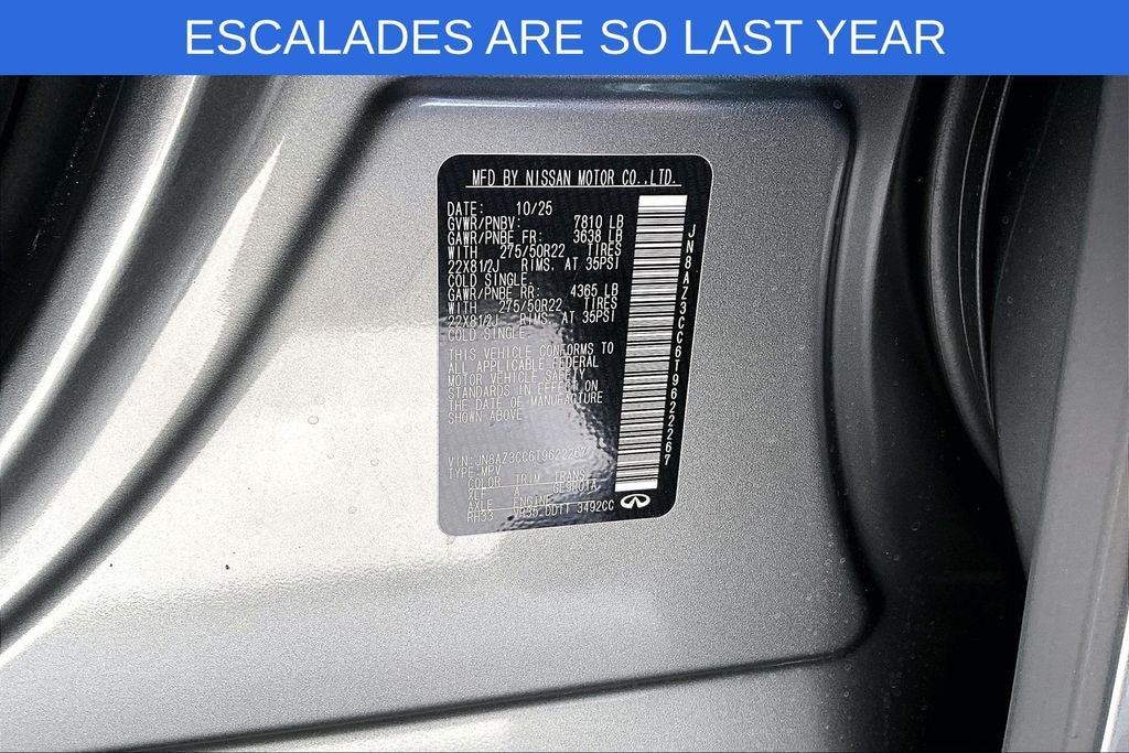 Grubbs INFINITI – The Only Authorized INFINITI Dealer in Grapevine Proudly serving drivers across the U.S. Since 1948! Explore one of the largest selections of New and Pre-Owned INFINITI vehicles in the area — all backed by our commitment to excellence and exceptional customer service. Every New Grubbs INFINITI comes with: Our Exclusive Lifetime Powertrain Warranty 3 Years of INFINITI-Recommended Maintenance – Included, with No Charge Valet Service when servicing your vehicle with pick up and drop at work or home and Hassle-Free Nationwide Shipping is Available. This 2026 INFINITI QX80 AUTOGRAPH in Dynamic Metal/Black Obsidian with Premium Burgundy interior is equipped with the following high value Features Premium Cargo Package (Cargo Blocks/Stabilizers, Carpeted Cargo Area Protector, Console Net, and Soft-Sided Cargo Cooler), 3rd row seats: bench, 4-Wheel Disc Brakes, ABS brakes, Adaptive suspension, Air Conditioning, Anti-whiplash front head restraints, Apple CarPlay/Android Auto, Auto High-beam Headlights, Auto tilt-away steering wheel, Auto-dimming door mirrors, Auto-dimming Rear-View mirror, Auto-leveling suspension, Automatic temperature control, Brake assist, Bumpers: body-color, Compass, Delay-off headlights, Driver door bin, Driver vanity mirror, Dual front impact airbags, Dual front side impact airbags, Electronic Stability Control, Emergency communication system: INFINITI InTouch, Four wheel independent suspension, Front anti-roll bar, Front Bucket Seats, Front Center Armrest, Front dual zone A/C, Front reading lights, Fully automatic headlights, Garage door transmitter: myQ Connected Garage, Genuine wood dashboard insert, Genuine wood door panel insert, Heads-Up Display, Heated and Climate Controlled Front Bucket Seats with Massage, Heated door mirrors, Heated front seats, Heated rear seats, Heated steering wheel, HVAC memory, Illuminated entry, Knee airbag, Leather steering wheel, Low tire pressure warning, Memory seat, Navigation system: Google Built-in, Occupant sensing airbag, Outside temperature display, Overhead airbag, Overhead console, Panic alarm, Passenger vanity mirror, Power door mirrors, Power driver seat, Power Liftgate, Power moonroof, Power passenger seat, Power steering, Power windows, Radio: Klipsch Premiere Audio System, Rain sensing wipers, Rear air conditioning, Rear anti-roll bar, Rear reading lights, Rear seat center armrest, Rear window defroster, Rear window wiper, Reclining 3rd row seat, Remote keyless entry, Security system, Semi-Aniline Premium Leather Seating Surfaces, Speed control, Speed-sensing steering, Splash Guards, Split folding rear seat, Spoiler, Steering wheel memory, Steering wheel mounted audio controls, Tachometer, Telescoping steering wheel, Tilt steering wheel, Traction control, Trip computer, Turn signal indicator mirrors, Two-Tone Premium Paint, Variably intermittent wipers, Ventilated front seats, Ventilated rear seats, and Wheels: 22 x 8.5J Cast Aluminum-Alloy.