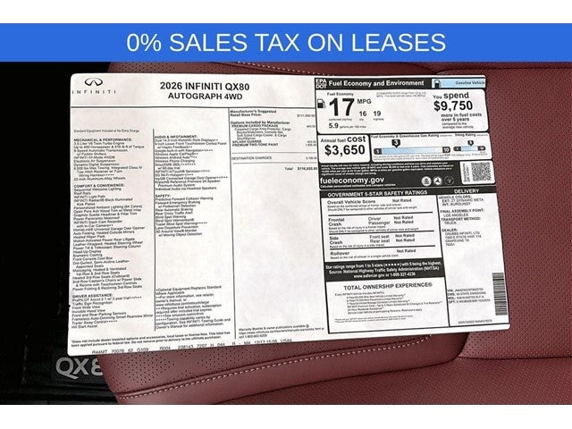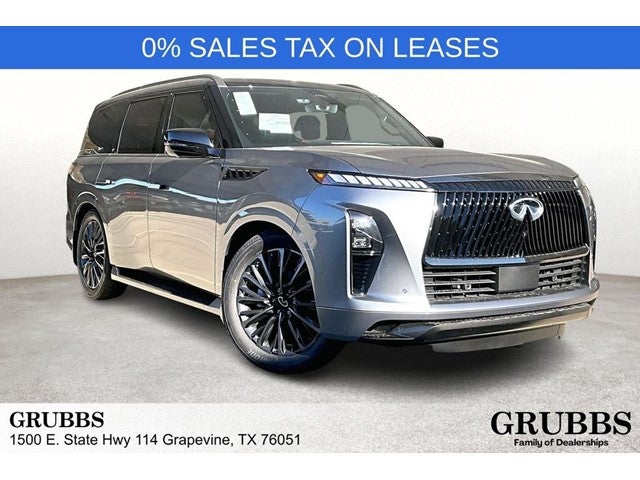 Grubbs INFINITI – The Only Authorized INFINITI Dealer in Grapevine Proudly serving drivers across the U.S. Since 1948! Explore one of the largest selections of New and Pre-Owned INFINITI vehicles in the area — all backed by our commitment to excellence and exceptional customer service. Every New Grubbs INFINITI comes with: Our Exclusive Lifetime Powertrain Warranty 3 Years of INFINITI-Recommended Maintenance – Included, with No Charge Valet Service when servicing your vehicle with pick up and drop at work or home and Hassle-Free Nationwide Shipping is Available. This 2026 INFINITI QX80 AUTOGRAPH in Dynamic Metal/Black Obsidian with Premium Burgundy interior is equipped with the following high value Features Premium Cargo Package (Cargo Blocks/Stabilizers, Cargo Shelf/Barrier, Carpeted Cargo Area Protector, Console Net, and Soft-Sided Cargo Cooler), 3rd row seats: bench, 4-Wheel Disc Brakes, ABS brakes, Adaptive suspension, Air Conditioning, Anti-whiplash front head restraints, Apple CarPlay/Android Auto, Auto High-beam Headlights, Auto tilt-away steering wheel, Auto-dimming door mirrors, Auto-dimming Rear-View mirror, Auto-leveling suspension, Automatic temperature control, Brake assist, Bumpers: body-color, Compass, Delay-off headlights, Driver door bin, Driver vanity mirror, Dual front impact airbags, Dual front side impact airbags, Electronic Stability Control, Emergency communication system: INFINITI InTouch, Four wheel independent suspension, Front anti-roll bar, Front Bucket Seats, Front Center Armrest, Front dual zone A/C, Front reading lights, Fully automatic headlights, Garage door transmitter: myQ Connected Garage, Genuine wood dashboard insert, Genuine wood door panel insert, Heads-Up Display, Heated and Climate Controlled Front Bucket Seats with Massage, Heated door mirrors, Heated front seats, Heated rear seats, Heated steering wheel, HVAC memory, Illuminated entry, Knee airbag, Leather steering wheel, Low tire pressure warning, Memory seat, Navigation system: Google Built-in, Occupant sensing airbag, Outside temperature display, Overhead airbag, Overhead console, Panic alarm, Passenger door bin, Passenger vanity mirror, Power door mirrors, Power driver seat, Power Liftgate, Power moonroof, Power passenger seat, Power steering, Power windows, Radio: Klipsch Premiere Audio System, Rain sensing wipers, Rear air conditioning, Rear reading lights, Rear seat center armrest, Rear window defroster, Rear window wiper, Reclining 3rd row seat, Remote keyless entry, Security system, Semi-Aniline Premium Leather Seating Surfaces, Speed control, Speed-sensing steering, Splash Guards, Split folding rear seat, Spoiler, Steering wheel memory, Steering wheel mounted audio controls, Tachometer, Telescoping steering wheel, Tilt steering wheel, Traction control, Trip computer, Turn signal indicator mirrors, Two-Tone Premium Paint, Variably intermittent wipers, Ventilated front seats, Ventilated rear seats, and Wheels: 22 x 8.5J Cast Aluminum-Alloy.