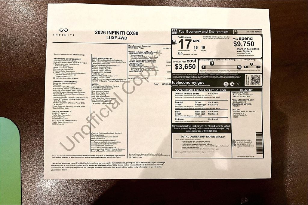 Grubbs INFINITI of San Antonio The only Authorized INFINITI Dealer in San Antonio with the largest New and Pre-Owned INFINITI Selection in the area. This 2026 INFINITI QX80 LUXE comes with 3 Year INFINITI Recommended Maintenance Included at no charge and is loaded with the following Factory Options: Cargo Package (Cargo Blocks/Stabilizers, Cargo Net, Carpeted Cargo Area Protector, Console Net, and Soft-Sided Cargo Cooler), Split Bench Seat Package, 14 Speakers, 3rd row seats: bench, 4-Wheel Disc Brakes, ABS brakes, Adaptive suspension, Air Conditioning, Alloy wheels, AM/FM radio: SiriusXM with 360L, Anti-whiplash front head restraints, Apple CarPlay/Android Auto, Audio memory, Auto High-beam Headlights, Auto tilt-away steering wheel, Auto-dimming door mirrors, Auto-dimming Rear-View mirror, Auto-leveling suspension, Automatic temperature control, Brake assist, Bumpers: body-color, Compass, Delay-off headlights, Driver door bin, Driver vanity mirror, Dual front impact airbags, Dual front side impact airbags, Electronic Stability Control, Emergency communication system: INFINITI InTouch, Four wheel independent suspension, Front anti-roll bar, Front Bucket Seats, Front Center Armrest, Front dual zone A/C, Front reading lights, Fully automatic headlights, Garage door transmitter: myQ Connected Garage, Heads-Up Display, Heated and Climate Controlled Front Bucket Seats, Heated door mirrors, Heated front seats, Heated rear seats, Heated steering wheel, HVAC memory, Illuminated entry, INFINITI Radiant Illuminated Silver Kick Plates, Knee airbag, Leather Seating Surfaces, Leather steering wheel, Low tire pressure warning, Memory seat, Navigation system: Google Built-in, Occupant sensing airbag, Outside temperature display, Overhead airbag, Overhead console, Panic alarm, Passenger door bin, Passenger vanity mirror, Power door mirrors, Power driver seat, Power Liftgate, Power moonroof, Power passenger seat, Power steering, Power windows, Radio data system, Radio: Klipsch Premium Audio System, Rain sensing wipers, Rear air conditioning, Rear anti-roll bar, Rear reading lights, Rear seat center armrest, Rear window defroster, Rear window wiper, Reclining 3rd row seat, Remote keyless entry, Security system, Speed control, Speed-sensing steering, Splash Guards, Split folding rear seat, Spoiler, Steering wheel memory, Steering wheel mounted audio controls, Tachometer, Telescoping steering wheel, Tilt steering wheel, Traction control, Trip computer, Turn signal indicator mirrors, Variably intermittent wipers, Ventilated front seats, Ventilated rear seats, and Wheels: 22 x 8.5J Cast Aluminum Alloy!! Priced below KBB Fair Purchase Price!