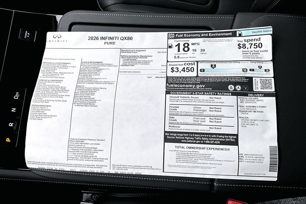 Grubbs INFINITI of San Antonio The only Authorized INFINITI Dealer in San Antonio with the largest New and Pre-Owned INFINITI Selection in the area. This 2026 INFINITI QX80 PURE comes with 3 Year INFINITI Recommended Maintenance Included at no charge and is loaded with the following Factory Options: Cargo Package (Cargo Blocks/Stabilizers, Cargo Net, Carpeted Cargo Area Protector, Console Net, and Soft-Sided Cargo Cooler), Split Bench Seat Package, 14 Speakers, 3rd row seats: bench, 4-Wheel Disc Brakes, ABS brakes, Air Conditioning, Alloy wheels, AM/FM radio: SiriusXM with 360L, Anti-whiplash front head restraints, Apple CarPlay/Android Auto, Audio memory, Auto High-beam Headlights, Auto tilt-away steering wheel, Auto-dimming door mirrors, Auto-dimming Rear-View mirror, Automatic temperature control, Brake assist, Bumpers: body-color, Compass, Delay-off headlights, Driver door bin, Driver vanity mirror, Dual front impact airbags, Dual front side impact airbags, Electronic Stability Control, Emergency communication system: INFINITI InTouch, Four wheel independent suspension, Front anti-roll bar, Front Bucket Seats, Front Center Armrest, Front dual zone A/C, Front reading lights, Fully automatic headlights, Garage door transmitter: myQ Connected Garage, Heated door mirrors, Heated Front Bucket Seats, Heated front seats, Heated rear seats, Heated steering wheel, HVAC memory, Illuminated entry, INFINITI Radiant Illuminated Silver Kick Plates, Knee airbag, Leather steering wheel, Low tire pressure warning, Memory seat, Navigation system: Google Built-in, Occupant sensing airbag, Outside temperature display, Overhead airbag, Overhead console, Panic alarm, Passenger door bin, Passenger vanity mirror, Power door mirrors, Power driver seat, Power Liftgate, Power moonroof, Power passenger seat, Power steering, Power windows, Radio data system, Radio: Klipsch Premium Audio System, Rain sensing wipers, Rear air conditioning, Rear anti-roll bar, Rear reading lights, Rear seat center armrest, Rear window defroster, Rear window wiper, Reclining 3rd row seat, Remote keyless entry, Security system, Speed control, Speed-sensing steering, Splash Guards, Split folding rear seat, Spoiler, Steering wheel memory, Steering wheel mounted audio controls, Super Premium Paint, Tachometer, Tailorfit-Appointed Seating Surfaces, Telescoping steering wheel, Tilt steering wheel, Traction control, Trip computer, Turn signal indicator mirrors, Variably intermittent wipers, and Wheels: 20 x 8.5J Aluminum Alloy!! Priced below KBB Fair Purchase Price!