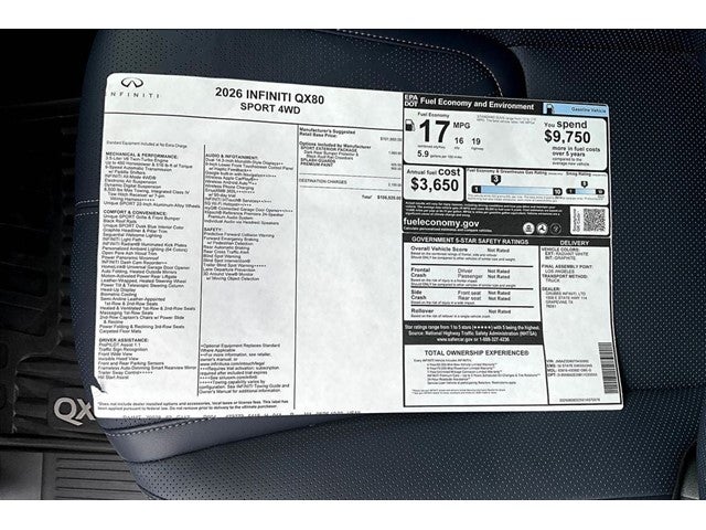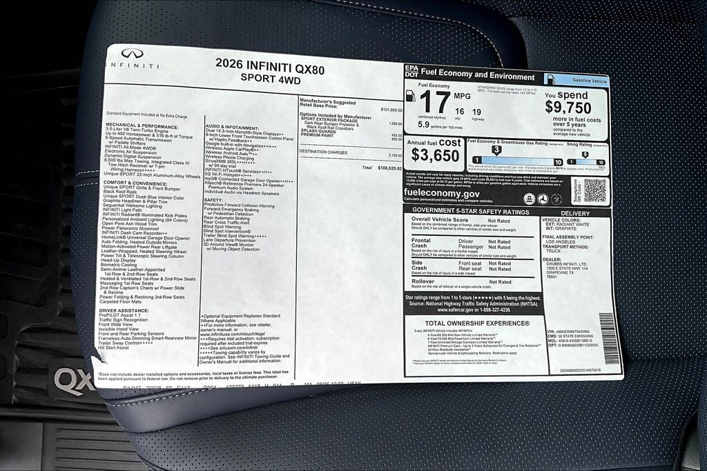 Grubbs INFINITI – The Only Authorized INFINITI Dealer in Grapevine Proudly serving drivers across the U.S. Since 1948! Explore one of the largest selections of New and Pre-Owned INFINITI vehicles in the area — all backed by our commitment to excellence and exceptional customer service. Every New Grubbs INFINITI comes with: Our Exclusive Lifetime Powertrain Warranty 3 Years of INFINITI-Recommended Maintenance – Included at No Charge Valet Service when servicing your vehicle with pick up and drop at work or home Hassle-Free Nationwide Shipping Available This 2026 INFINITI QX80 SPORT in Radiant White with Dusk Blue interior comes equipped with the following high value Features SPORT Exterior Package (Black Roof Rail Crossbars and Dark Chrome Rear Bumper Protector), Auto-leveling suspension, Heads-Up Display, Heated front seats, Heated rear seats, Memory seat, Navigation system: Google Built-in, Power Liftgate, Power moonroof, Radio: Klipsch Reference Premiere Audio System, Rain sensing wipers, Unique SPORT Semi-Aniline Leather Seating Surfaces, Ventilated front seats, Ventilated rear seats, and Wheels: 22 x 8.5J Unique SPORT Alloy.