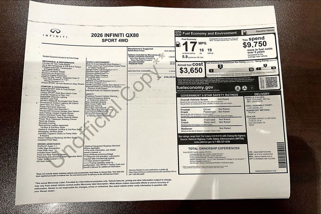 Grubbs INFINITI of San Antonio The only Authorized INFINITI Dealer in San Antonio with the largest New and Pre-Owned INFINITI Selection in the area. This 2026 INFINITI QX80 SPORT comes with 3 Year INFINITI Recommended Maintenance Included at no charge and is loaded with the following Factory Options: Sport Exterior Package (Black Roof Rail Crossbars and Dark Chrome Rear Bumper Protector), 3rd row seats: bench, 4-Wheel Disc Brakes, ABS brakes, Adaptive suspension, Air Conditioning, Alloy wheels, AM/FM radio: SiriusXM with 360L, Anti-whiplash front head restraints, Apple CarPlay/Android Auto, Audio memory, Auto High-beam Headlights, Auto tilt-away steering wheel, Auto-dimming door mirrors, Auto-dimming Rear-View mirror, Auto-leveling suspension, Automatic temperature control, Brake assist, Compass, Delay-off headlights, Driver door bin, Driver vanity mirror, Dual front impact airbags, Dual front side impact airbags, Electronic Stability Control, Emergency communication system: INFINITI InTouch, Four wheel independent suspension, Front anti-roll bar, Front Bucket Seats, Front Center Armrest, Front dual zone A/C, Front reading lights, Fully automatic headlights, Garage door transmitter: HomeLink, Genuine wood dashboard insert, Genuine wood door panel insert, Heads-Up Display, Heated and Climate Controlled Front Bucket Seats with Massage, Heated door mirrors, Heated front seats, Heated rear seats, Heated steering wheel, HVAC memory, Illuminated entry, Knee airbag, Leather steering wheel, Low tire pressure warning, Memory seat, Navigation system: Google Built-in, Occupant sensing airbag, Outside temperature display, Overhead airbag, Overhead console, Panic alarm, Passenger door bin, Passenger vanity mirror, Power door mirrors, Power driver seat, Power Liftgate, Power moonroof, Power passenger seat, Power steering, Power windows, Radio data system, Radio: Klipsch Premiere Audio System, Rain sensing wipers, Rear air conditioning, Rear anti-roll bar, Rear reading lights, Rear seat center armrest, Rear window defroster, Rear window wiper, Reclining 3rd row seat, Remote keyless entry, Security system, Speed control, Speed-sensing steering, Splash Guards, Split folding rear seat, Spoiler, Steering wheel memory, Steering wheel mounted audio controls, Tachometer, Telescoping steering wheel, Tilt steering wheel, Traction control, Trip computer, Turn signal indicator mirrors, Unique SPORT Semi-Aniline Leather Seating Surfaces, Variably intermittent wipers, Ventilated front seats, Ventilated rear seats, and Wheels: 22 x 8.5J Unique SPORT Alloy!! Priced below KBB Fair Purchase Price!