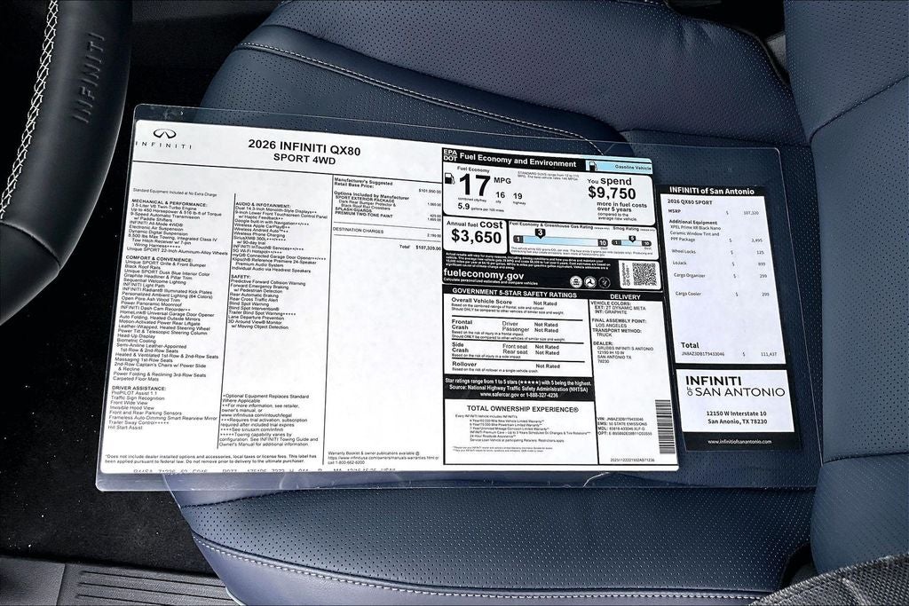 Grubbs INFINITI of San Antonio The only Authorized INFINITI Dealer in San Antonio with the largest New and Pre-Owned INFINITI Selection in the area. This 2026 INFINITI QX80 SPORT comes with 3 Year INFINITI Recommended Maintenance Included at no charge and is loaded with the following Factory Options: Sport Exterior Package (Black Roof Rail Crossbars and Dark Chrome Rear Bumper Protector), 3rd row seats: bench, 4-Wheel Disc Brakes, ABS brakes, Adaptive suspension, Air Conditioning, Alloy wheels, AM/FM radio: SiriusXM with 360L, Anti-whiplash front head restraints, Apple CarPlay/Android Auto, Audio memory, Auto High-beam Headlights, Auto tilt-away steering wheel, Auto-dimming door mirrors, Auto-dimming Rear-View mirror, Auto-leveling suspension, Automatic temperature control, Brake assist, Compass, Delay-off headlights, Driver door bin, Driver vanity mirror, Dual front impact airbags, Dual front side impact airbags, Electronic Stability Control, Emergency communication system: INFINITI InTouch, Four wheel independent suspension, Front anti-roll bar, Front Bucket Seats, Front Center Armrest, Front dual zone A/C, Front reading lights, Fully automatic headlights, Garage door transmitter: HomeLink, Genuine wood dashboard insert, Genuine wood door panel insert, Heads-Up Display, Heated and Climate Controlled Front Bucket Seats with Massage, Heated door mirrors, Heated front seats, Heated rear seats, Heated steering wheel, HVAC memory, Illuminated entry, Knee airbag, Leather steering wheel, Low tire pressure warning, Memory seat, Navigation system: Google Built-in, Occupant sensing airbag, Outside temperature display, Overhead airbag, Overhead console, Panic alarm, Passenger door bin, Passenger vanity mirror, Power door mirrors, Power driver seat, Power Liftgate, Power moonroof, Power passenger seat, Power steering, Power windows, Radio data system, Radio: Klipsch Premiere Audio System, Rain sensing wipers, Rear air conditioning, Rear anti-roll bar, Rear reading lights, Rear seat center armrest, Rear window defroster, Rear window wiper, Reclining 3rd row seat, Remote keyless entry, Security system, Speed control, Speed-sensing steering, Splash Guards, Split folding rear seat, Spoiler, Steering wheel memory, Steering wheel mounted audio controls, Tachometer, Telescoping steering wheel, Tilt steering wheel, Traction control, Trip computer, Turn signal indicator mirrors, Two-Tone Premium Paint, Unique SPORT Semi-Aniline Leather Seating Surfaces, Variably intermittent wipers, Ventilated front seats, Ventilated rear seats, and Wheels: 22 x 8.5J Unique SPORT Alloy!! Priced below KBB Fair Purchase Price!