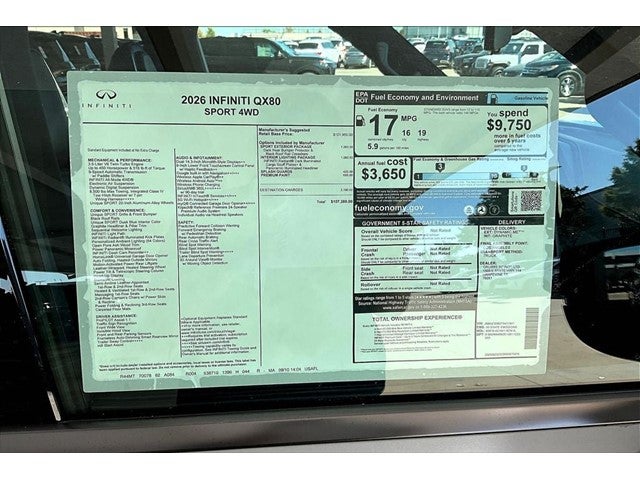 Grubbs INFINITI – The Only Authorized INFINITI Dealer in Grapevine Proudly serving drivers across the U.S. Since 1948! Explore one of the largest selections of New and Pre-Owned INFINITI vehicles in the area — all backed by our commitment to excellence and exceptional customer service. Every New Grubbs INFINITI comes with: Our Exclusive Lifetime Powertrain Warranty 3 Years of INFINITI-Recommended Maintenance – Included at No Charge Valet Service when servicing your vehicle with pick up and drop at work or home Hassle-Free Nationwide Shipping Available This 2026 INFINITI QX80 SPORT in Dynamic Metal with Graphite interior comes equipped with the following high value Features Black Interior Lighting Package (INFINITI Radiant Black Cargo Scuff Plates and Panoramic Illuminated Headliner), SPORT Exterior Package (Black Roof Rail Crossbars and Dark Chrome Rear Bumper Protector), Auto-leveling suspension, Automatic temperature control, Four wheel independent suspension, Heads-Up Display, Heated front seats, Heated rear seats, HVAC memory, Memory seat, Navigation system: Google Built-in, Power driver seat, Power Liftgate, Power moonroof, Radio: Klipsch Reference Premiere Audio System, Security system, Unique SPORT Semi-Aniline Leather Seating Surfaces, Ventilated front seats, Ventilated rear seats, and Wheels: 22 x 8.5J Unique SPORT Alloy.