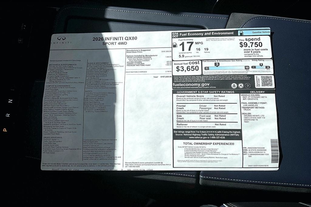 Grubbs INFINITI – The Only Authorized INFINITI Dealer in Grapevine Proudly serving drivers across the U.S. Since 1948! Explore one of the largest selections of New and Pre-Owned INFINITI vehicles in the area — all backed by our commitment to excellence and exceptional customer service. Every New Grubbs INFINITI comes with: Our Exclusive Lifetime Powertrain Warranty 3 Years of INFINITI-Recommended Maintenance – Included, with No Charge Valet Service when servicing your vehicle with pick up and drop at work or home and Hassle-Free Nationwide Shipping is Available. This 2026 INFINITI QX80 SPORT in Dynamic Metal/Black Obsidian with Premium Graphite interior is equipped with the following high value Features Sport Exterior Package (Black Roof Rail Crossbars and Dark Chrome Rear Bumper Protector), 3rd row seats: bench, 4-Wheel Disc Brakes, ABS brakes, Adaptive suspension, Air Conditioning, Alloy wheels, Anti-whiplash front head restraints, Apple CarPlay/Android Auto, Auto High-beam Headlights, Auto tilt-away steering wheel, Auto-dimming door mirrors, Auto-dimming Rear-View mirror, Auto-leveling suspension, Automatic temperature control, Brake assist, Compass, Delay-off headlights, Driver door bin, Driver vanity mirror, Dual front impact airbags, Dual front side impact airbags, Electronic Stability Control, Emergency communication system: INFINITI InTouch, Four wheel independent suspension, Front anti-roll bar, Front Bucket Seats, Front Center Armrest, Front dual zone A/C, Front reading lights, Fully automatic headlights, Garage door transmitter: HomeLink, Genuine wood dashboard insert, Genuine wood door panel insert, Heads-Up Display, Heated and Climate Controlled Front Bucket Seats with Massage, Heated door mirrors, Heated front seats, Heated rear seats, Heated steering wheel, HVAC memory, Illuminated entry, Knee airbag, Leather steering wheel, Low tire pressure warning, Memory seat, Navigation system: Google Built-in, Occupant sensing airbag, Outside temperature display, Overhead airbag, Overhead console, Passenger door bin, Passenger vanity mirror, Power door mirrors, Power driver seat, Power Liftgate, Power moonroof, Power passenger seat, Power steering, Power windows, Radio: Klipsch Premiere Audio System, Rain sensing wipers, Rear air conditioning, Rear anti-roll bar, Rear reading lights, Rear seat center armrest, Rear window defroster, Rear window wiper, Reclining 3rd row seat, Remote keyless entry, Security system, Speed control, Speed-sensing steering, Splash Guards, Split folding rear seat, Spoiler, Steering wheel memory, Steering wheel mounted audio controls, Tachometer, Telescoping steering wheel, Tilt steering wheel, Traction control, Trip computer, Turn signal indicator mirrors, Two-Tone Premium Paint, Umbrella Holder, Unique SPORT Semi-Aniline Leather Seating Surfaces, Variably intermittent wipers, Ventilated front seats, Ventilated rear seats, and Wheels: 22 x 8.5J Unique SPORT Alloy.