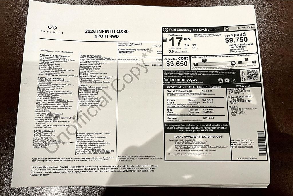 Grubbs INFINITI of San Antonio The only Authorized INFINITI Dealer in San Antonio with the largest New and Pre-Owned INFINITI Selection in the area. This 2026 INFINITI QX80 SPORT comes with 3 Year INFINITI Recommended Maintenance Included at no charge and is loaded with the following Factory Options: Sport Exterior Package (Black Roof Rail Crossbars and Dark Chrome Rear Bumper Protector), 3rd row seats: bench, 4-Wheel Disc Brakes, ABS brakes, Adaptive suspension, Air Conditioning, Alloy wheels, AM/FM radio: SiriusXM with 360L, Anti-whiplash front head restraints, Apple CarPlay/Android Auto, Audio memory, Auto High-beam Headlights, Auto tilt-away steering wheel, Auto-dimming door mirrors, Auto-dimming Rear-View mirror, Auto-leveling suspension, Automatic temperature control, Brake assist, Compass, Delay-off headlights, Driver door bin, Driver vanity mirror, Dual front impact airbags, Dual front side impact airbags, Electronic Stability Control, Emergency communication system: INFINITI InTouch, Four wheel independent suspension, Front anti-roll bar, Front Bucket Seats, Front Center Armrest, Front dual zone A/C, Front reading lights, Fully automatic headlights, Garage door transmitter: HomeLink, Genuine wood dashboard insert, Genuine wood door panel insert, Heads-Up Display, Heated and Climate Controlled Front Bucket Seats with Massage, Heated door mirrors, Heated front seats, Heated rear seats, Heated steering wheel, HVAC memory, Illuminated entry, Knee airbag, Leather steering wheel, Low tire pressure warning, Memory seat, Navigation system: Google Built-in, Occupant sensing airbag, Outside temperature display, Overhead airbag, Overhead console, Panic alarm, Passenger door bin, Passenger vanity mirror, Power door mirrors, Power driver seat, Power Liftgate, Power moonroof, Power passenger seat, Power steering, Power windows, Radio data system, Radio: Klipsch Premiere Audio System, Rain sensing wipers, Rear air conditioning, Rear anti-roll bar, Rear reading lights, Rear seat center armrest, Rear window defroster, Rear window wiper, Reclining 3rd row seat, Remote keyless entry, Security system, Speed control, Speed-sensing steering, Splash Guards, Split folding rear seat, Spoiler, Steering wheel memory, Steering wheel mounted audio controls, Super Premium Paint, Tachometer, Telescoping steering wheel, Tilt steering wheel, Traction control, Trip computer, Turn signal indicator mirrors, Unique SPORT Semi-Aniline Leather Seating Surfaces, Variably intermittent wipers, Ventilated front seats, Ventilated rear seats, and Wheels: 22 x 8.5J Unique SPORT Alloy!! Priced below KBB Fair Purchase Price!