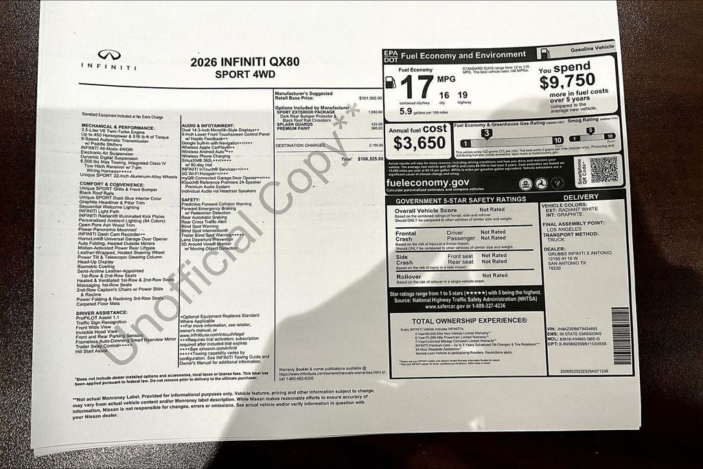 Grubbs INFINITI of San Antonio The only Authorized INFINITI Dealer in San Antonio with the largest New and Pre-Owned INFINITI Selection in the area. This 2026 INFINITI QX80 SPORT comes with 3 Year INFINITI Recommended Maintenance Included at no charge and is loaded with the following Factory Options: Sport Exterior Package (Black Roof Rail Crossbars and Dark Chrome Rear Bumper Protector), 3rd row seats: bench, 4-Wheel Disc Brakes, ABS brakes, Adaptive suspension, Air Conditioning, Alloy wheels, AM/FM radio: SiriusXM with 360L, Anti-whiplash front head restraints, Apple CarPlay/Android Auto, Audio memory, Auto High-beam Headlights, Auto tilt-away steering wheel, Auto-dimming door mirrors, Auto-dimming Rear-View mirror, Auto-leveling suspension, Automatic temperature control, Brake assist, Compass, Delay-off headlights, Driver door bin, Driver vanity mirror, Dual front impact airbags, Dual front side impact airbags, Electronic Stability Control, Emergency communication system: INFINITI InTouch, Four wheel independent suspension, Front anti-roll bar, Front Bucket Seats, Front Center Armrest, Front dual zone A/C, Front reading lights, Fully automatic headlights, Garage door transmitter: HomeLink, Genuine wood dashboard insert, Genuine wood door panel insert, Heads-Up Display, Heated and Climate Controlled Front Bucket Seats with Massage, Heated door mirrors, Heated front seats, Heated rear seats, Heated steering wheel, HVAC memory, Illuminated entry, Knee airbag, Leather steering wheel, Low tire pressure warning, Memory seat, Navigation system: Google Built-in, Occupant sensing airbag, Outside temperature display, Overhead airbag, Overhead console, Panic alarm, Passenger door bin, Passenger vanity mirror, Power door mirrors, Power driver seat, Power Liftgate, Power moonroof, Power passenger seat, Power steering, Power windows, Radio data system, Radio: Klipsch Premiere Audio System, Rain sensing wipers, Rear air conditioning, Rear anti-roll bar, Rear reading lights, Rear seat center armrest, Rear window defroster, Rear window wiper, Reclining 3rd row seat, Remote keyless entry, Security system, Speed control, Speed-sensing steering, Splash Guards, Split folding rear seat, Spoiler, Steering wheel memory, Steering wheel mounted audio controls, Super Premium Paint, Tachometer, Telescoping steering wheel, Tilt steering wheel, Traction control, Trip computer, Turn signal indicator mirrors, Unique SPORT Semi-Aniline Leather Seating Surfaces, Variably intermittent wipers, Ventilated front seats, Ventilated rear seats, and Wheels: 22 x 8.5J Unique SPORT Alloy!! Priced below KBB Fair Purchase Price!