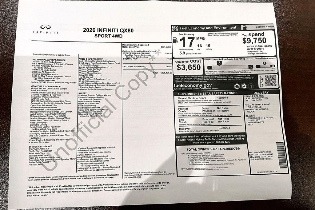 Grubbs INFINITI of San Antonio The only Authorized INFINITI Dealer in San Antonio with the largest New and Pre-Owned INFINITI Selection in the area. This 2026 INFINITI QX80 SPORT comes with 3 Year INFINITI Recommended Maintenance Included at no charge and is loaded with the following Factory Options: Sport Exterior Package (Black Roof Rail Crossbars and Dark Chrome Rear Bumper Protector), 3rd row seats: bench, 4-Wheel Disc Brakes, ABS brakes, Adaptive suspension, Air Conditioning, Alloy wheels, AM/FM radio: SiriusXM with 360L, Anti-whiplash front head restraints, Apple CarPlay/Android Auto, Audio memory, Auto High-beam Headlights, Auto tilt-away steering wheel, Auto-dimming door mirrors, Auto-dimming Rear-View mirror, Auto-leveling suspension, Automatic temperature control, Brake assist, Compass, Delay-off headlights, Driver door bin, Driver vanity mirror, Dual front impact airbags, Dual front side impact airbags, Electronic Stability Control, Emergency communication system: INFINITI InTouch, Four wheel independent suspension, Front anti-roll bar, Front Bucket Seats, Front Center Armrest, Front dual zone A/C, Front reading lights, Fully automatic headlights, Garage door transmitter: HomeLink, Genuine wood dashboard insert, Genuine wood door panel insert, Heads-Up Display, Heated and Climate Controlled Front Bucket Seats with Massage, Heated door mirrors, Heated front seats, Heated rear seats, Heated steering wheel, HVAC memory, Illuminated entry, Knee airbag, Leather steering wheel, Low tire pressure warning, Memory seat, Navigation system: Google Built-in, Occupant sensing airbag, Outside temperature display, Overhead airbag, Overhead console, Panic alarm, Passenger door bin, Passenger vanity mirror, Power door mirrors, Power driver seat, Power Liftgate, Power moonroof, Power passenger seat, Power steering, Power windows, Radio data system, Radio: Klipsch Premiere Audio System, Rain sensing wipers, Rear air conditioning, Rear anti-roll bar, Rear reading lights, Rear seat center armrest, Rear window defroster, Rear window wiper, Reclining 3rd row seat, Remote keyless entry, Security system, Speed control, Speed-sensing steering, Splash Guards, Split folding rear seat, Spoiler, Steering wheel memory, Steering wheel mounted audio controls, Super Premium Paint, Tachometer, Telescoping steering wheel, Tilt steering wheel, Traction control, Trip computer, Turn signal indicator mirrors, Unique SPORT Semi-Aniline Leather Seating Surfaces, Variably intermittent wipers, Ventilated front seats, Ventilated rear seats, and Wheels: 22 x 8.5J Unique SPORT Alloy!! Priced below KBB Fair Purchase Price!