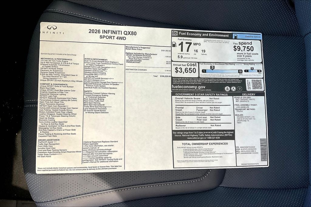 Grubbs INFINITI – The Only Authorized INFINITI Dealer in Grapevine Proudly serving drivers across the U.S. Since 1948! Explore one of the largest selections of New and Pre-Owned INFINITI vehicles in the area — all backed by our commitment to excellence and exceptional customer service. Every New Grubbs INFINITI comes with: Our Exclusive Lifetime Powertrain Warranty 3 Years of INFINITI-Recommended Maintenance – Included, with No Charge Valet Service when servicing your vehicle with pick up and drop at work or home and Hassle-Free Nationwide Shipping is Available. This 2026 INFINITI QX80 SPORT in Radiant White with Premium Dusk Blue interior is equipped with the following high value Features Apple CarPlay/Android Auto, Auto-leveling suspension, Automatic temperature control, Black Roof Rail Crossbars, Dark Chrome Rear Bumper Protector, Heads-Up Display, Heated front seats, Heated rear seats, Memory seat, Navigation system: Google Built-in, Power Liftgate, Power moonroof, Rain sensing wipers, Security system, Steering wheel mounted audio controls, Super Premium Paint, Wheels: 22 x 8.5J Unique SPORT Alloy, 3rd row seats: bench, 4-Wheel Disc Brakes, ABS brakes, Adaptive suspension, Air Conditioning, Alloy wheels, AM/FM radio: SiriusXM with 360L, Anti-whiplash front head restraints, Audio memory, Auto High-beam Headlights, Auto tilt-away steering wheel, Auto-dimming door mirrors, Auto-dimming Rear-View mirror, Brake assist, Compass, Delay-off headlights, Driver door bin, Driver vanity mirror, Dual front impact airbags, Dual front side impact airbags, Electronic Stability Control, Emergency communication system: INFINITI InTouch, Four wheel independent suspension, Front anti-roll bar, Front Bucket Seats, Front Center Armrest, Front dual zone A/C, Front reading lights, Fully automatic headlights, Garage door transmitter: HomeLink, Genuine wood dashboard insert, Genuine wood door panel insert, Heated door mirrors, Heated steering wheel, HVAC memory, Illuminated entry, Knee airbag, Leather steering wheel, Low tire pressure warning, Occupant sensing airbag, Outside temperature display, Overhead airbag, Overhead console, Panic alarm, Passenger door bin, Passenger vanity mirror, Power door mirrors, Power driver seat, Power passenger seat, Power steering, Power windows, Radio data system, Rear air conditioning, Rear anti-roll bar, Rear reading lights, Rear seat center armrest, Rear window defroster, Rear window wiper, Reclining 3rd row seat, Remote keyless entry, Speed control, Speed-sensing steering, Splash Guards, Split folding rear seat, Spoiler, Steering wheel memory, Tachometer, Telescoping steering wheel, Tilt steering wheel, Traction control, Trip computer, Turn signal indicator mirrors, Unique SPORT Semi-Aniline Leather Seating Surfaces, Variably intermittent wipers, Ventilated front seats, and Ventilated rear seats.
