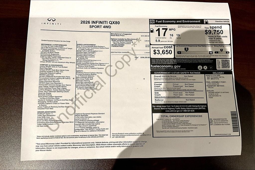 Grubbs INFINITI of San Antonio The only Authorized INFINITI Dealer in San Antonio with the largest New and Pre-Owned INFINITI Selection in the area. This 2026 INFINITI QX80 SPORT comes with 3 Year INFINITI Recommended Maintenance Included at no charge and is loaded with the following Factory Options: Sport Exterior Package (Black Roof Rail Crossbars and Dark Chrome Rear Bumper Protector), 3rd row seats: bench, 4-Wheel Disc Brakes, ABS brakes, Adaptive suspension, Air Conditioning, Alloy wheels, AM/FM radio: SiriusXM with 360L, Anti-whiplash front head restraints, Apple CarPlay/Android Auto, Audio memory, Auto High-beam Headlights, Auto tilt-away steering wheel, Auto-dimming door mirrors, Auto-dimming Rear-View mirror, Auto-leveling suspension, Automatic temperature control, Brake assist, Compass, Delay-off headlights, Driver door bin, Driver vanity mirror, Dual front impact airbags, Dual front side impact airbags, Electronic Stability Control, Emergency communication system: INFINITI InTouch, Four wheel independent suspension, Front anti-roll bar, Front Bucket Seats, Front Center Armrest, Front dual zone A/C, Front reading lights, Fully automatic headlights, Garage door transmitter: HomeLink, Genuine wood dashboard insert, Genuine wood door panel insert, Heads-Up Display, Heated and Climate Controlled Front Bucket Seats with Massage, Heated door mirrors, Heated front seats, Heated rear seats, Heated steering wheel, HVAC memory, Illuminated entry, Knee airbag, Leather steering wheel, Low tire pressure warning, Memory seat, Navigation system: Google Built-in, Occupant sensing airbag, Outside temperature display, Overhead airbag, Overhead console, Panic alarm, Passenger door bin, Passenger vanity mirror, Power door mirrors, Power driver seat, Power Liftgate, Power moonroof, Power passenger seat, Power steering, Power windows, Radio data system, Radio: Klipsch Premiere Audio System, Rain sensing wipers, Rear air conditioning, Rear anti-roll bar, Rear reading lights, Rear seat center armrest, Rear window defroster, Rear window wiper, Reclining 3rd row seat, Remote keyless entry, Security system, Speed control, Speed-sensing steering, Splash Guards, Split folding rear seat, Spoiler, Steering wheel memory, Steering wheel mounted audio controls, Tachometer, Telescoping steering wheel, Tilt steering wheel, Traction control, Trip computer, Turn signal indicator mirrors, Unique SPORT Semi-Aniline Leather Seating Surfaces, Variably intermittent wipers, Ventilated front seats, Ventilated rear seats, and Wheels: 22 x 8.5J Unique SPORT Alloy!! Priced below KBB Fair Purchase Price!