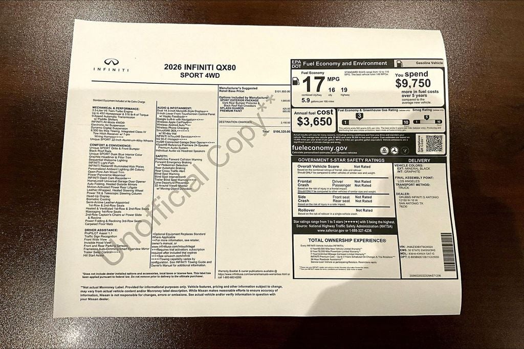 Grubbs INFINITI of San Antonio The only Authorized INFINITI Dealer in San Antonio with the largest New and Pre-Owned INFINITI Selection in the area. This 2026 INFINITI QX80 SPORT comes with 3 Year INFINITI Recommended Maintenance Included at no charge and is loaded with the following Factory Options: Sport Exterior Package (Black Roof Rail Crossbars and Dark Chrome Rear Bumper Protector), 3rd row seats: bench, 4-Wheel Disc Brakes, ABS brakes, Adaptive suspension, Air Conditioning, Alloy wheels, AM/FM radio: SiriusXM with 360L, Anti-whiplash front head restraints, Apple CarPlay/Android Auto, Audio memory, Auto High-beam Headlights, Auto tilt-away steering wheel, Auto-dimming door mirrors, Auto-dimming Rear-View mirror, Auto-leveling suspension, Automatic temperature control, Brake assist, Compass, Delay-off headlights, Driver door bin, Driver vanity mirror, Dual front impact airbags, Dual front side impact airbags, Electronic Stability Control, Emergency communication system: INFINITI InTouch, Four wheel independent suspension, Front anti-roll bar, Front Bucket Seats, Front Center Armrest, Front dual zone A/C, Front reading lights, Fully automatic headlights, Garage door transmitter: HomeLink, Genuine wood dashboard insert, Genuine wood door panel insert, Heads-Up Display, Heated and Climate Controlled Front Bucket Seats with Massage, Heated door mirrors, Heated front seats, Heated rear seats, Heated steering wheel, HVAC memory, Illuminated entry, Knee airbag, Leather steering wheel, Low tire pressure warning, Memory seat, Navigation system: Google Built-in, Occupant sensing airbag, Outside temperature display, Overhead airbag, Overhead console, Panic alarm, Passenger door bin, Passenger vanity mirror, Power door mirrors, Power driver seat, Power Liftgate, Power moonroof, Power passenger seat, Power steering, Power windows, Radio data system, Radio: Klipsch Premiere Audio System, Rain sensing wipers, Rear air conditioning, Rear anti-roll bar, Rear reading lights, Rear seat center armrest, Rear window defroster, Rear window wiper, Reclining 3rd row seat, Remote keyless entry, Security system, Speed control, Speed-sensing steering, Splash Guards, Split folding rear seat, Spoiler, Steering wheel memory, Steering wheel mounted audio controls, Tachometer, Telescoping steering wheel, Tilt steering wheel, Traction control, Trip computer, Turn signal indicator mirrors, Unique SPORT Semi-Aniline Leather Seating Surfaces, Variably intermittent wipers, Ventilated front seats, Ventilated rear seats, and Wheels: 22 x 8.5J Unique SPORT Alloy!! Priced below KBB Fair Purchase Price!