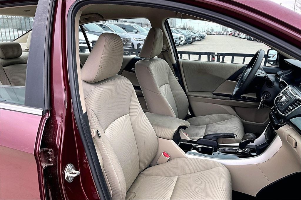 CARFAX One-Owner. Recent Arrival! 2016 Honda Accord LX Basque Red Pearl II LX 2.4L I4 DOHC i-VTEC 16V CVT FWD 4D Sedan Additional Features; Ivory w/Cloth Seat Trim, 16 Alloy Wheels, 160-Watt AM/FM/CD Audio System, 4 Speakers, 4-Wheel Disc Brakes, ABS brakes, Air Conditioning, Alloy wheels, AM/FM radio, Automatic temperature control, Brake assist, Bumpers: body-color, CD player, Cloth Seat Trim, Delay-off headlights, Driver door bin, Driver vanity mirror, Dual front impact airbags, Dual front side impact airbags, Electronic Stability Control, Exterior Parking Camera Rear, Four wheel independent suspension, Front anti-roll bar, Front Bucket Seats, Front Center Armrest, Front dual zone A/C, Front reading lights, Fully automatic headlights, Illuminated entry, Leather Shift Knob, Low tire pressure warning, Occupant sensing airbag, Outside temperature display, Overhead airbag, Overhead console, Panic alarm, Passenger door bin, Passenger vanity mirror, Power door mirrors, Power steering, Power windows, Radio data system, Rear anti-roll bar, Rear seat center armrest, Rear window defroster, Remote keyless entry, Security system, Speed control, Speed-sensing steering, Speed-Sensitive Wipers, Steering wheel mounted audio controls, Tachometer, Telescoping steering wheel, Tilt steering wheel, Traction control, Trip computer, and Variably intermittent wipers.