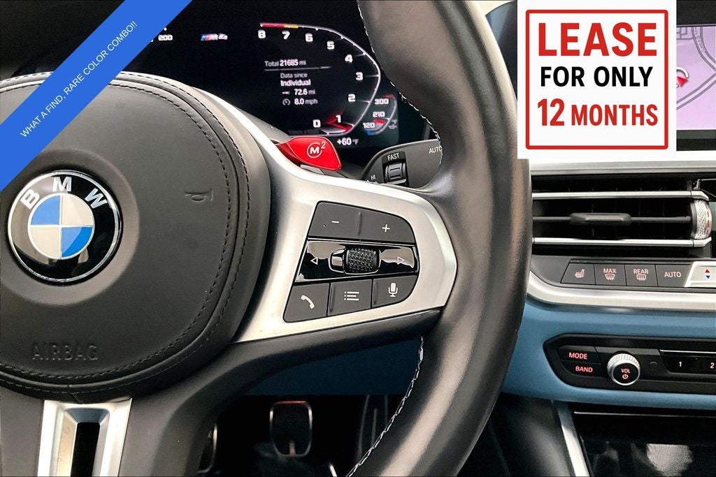 This M4 also boasts a wealth of premium amenities, from the heated and ventilated front seats to the panoramic moonroof, ensuring your every drive is as comfortable as it is exhilarating. The 360° view parking camera and blind spot monitoring provide added peace of mind, while the intuitive infotainment system with Apple CarPlay and Android Auto integration keeps you seamlessly connected.