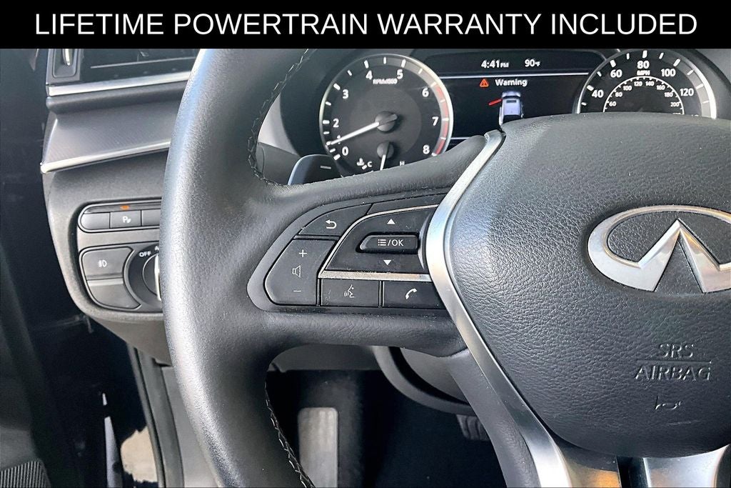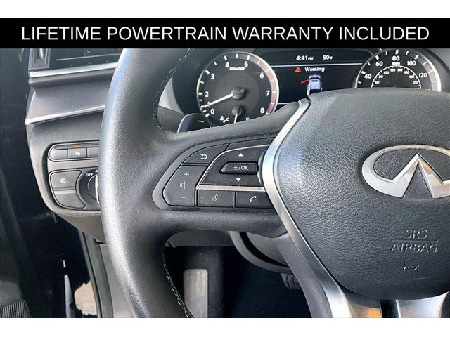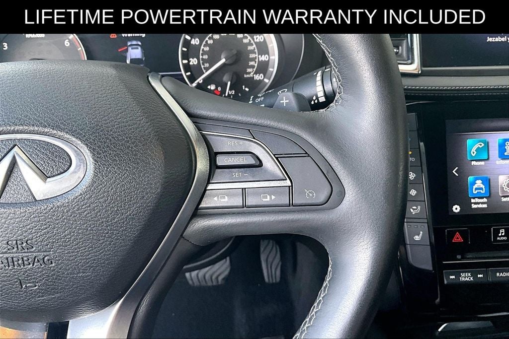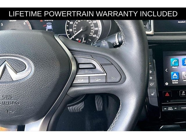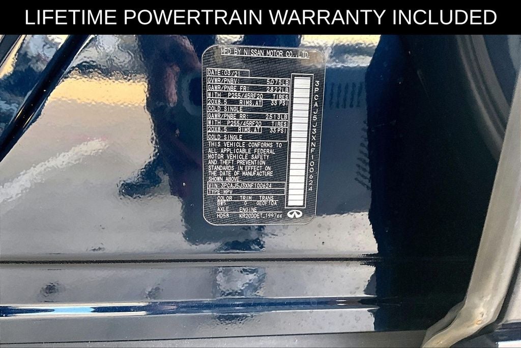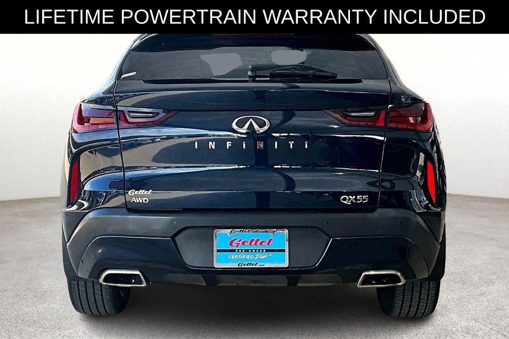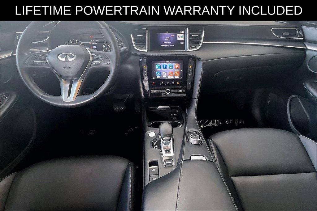 Recent Arrival! Certified. Grubbs INFINITI offers this Market Priced Pre-Owned 2022 INFINITI QX55 LUXE in Hermosa Blue with a premium Graphite interior. Fully inspected and all Eligible Vehicles are backed by our exclusive Grubbs Lifetime Powertrain Warranty, it comes loaded with features including Cargo Package (Black Film Rear Bumper Protector, Cargo Net, and Reversible Cargo Mat), Certified Pre-Owned Select Certified, 4-Wheel Disc Brakes, 5.846 Axle Ratio, 6 Speakers, ABS brakes, Air Conditioning, Alloy wheels, AM/FM radio: SiriusXM, AM/FM/CD Audio System, Auto High-beam Headlights, Auto-dimming Rear-View mirror, Automatic temperature control, Black Splash Guards (Set of 4), Blind Spot Warning, Brake assist, Bumpers: body-color, Carpeted Floor Mats, CD player, Delay-off headlights, Driver door bin, Driver vanity mirror, Dual front impact airbags, Dual front side impact airbags, Electronic Stability Control, Emergency communication system: INFINITI InTouch, Exterior Parking Camera Rear, Fog lights, Four wheel independent suspension, Front anti-roll bar, Front Bucket Seats, Front Center Armrest, Front dual zone A/C, Front reading lights, Fully automatic headlights, Garage door transmitter: HomeLink, Heated Front Bucket Seats, Heated front seats, Illuminated entry, Knee airbag, Leather Shift Knob, Leatherette Seat Trim, Low tire pressure warning, Occupant sensing airbag, Outside temperature display, Overhead airbag, Overhead console, Panic alarm, Passenger door bin, Passenger vanity mirror, Power door mirrors, Power driver seat, Power Liftgate, Power moonroof, Power passenger seat, Power steering, Power windows, Radio data system, Rear anti-roll bar, Rear Parking Sensors, Rear reading lights, Rear seat center armrest, Rear window defroster, Rear window wiper, Remote keyless entry, Security system, Speed control, Speed-sensing steering, Speed-Sensitive Wipers, Split folding rear seat, Spoiler, Steering wheel mounted audio controls, Tachometer, Telescoping steering wheel, Tilt steering wheel, Traction control, Trip computer, Turn signal indicator mirrors, Variably intermittent wipers, and Wheels: 20 x 8.5 Machine Finish Aluminum Alloy. 2022 INFINITI QX55 LUXE 4D Sport Utility AWD I4 CVT Hermosa Blue Upgraded Wheel Package.