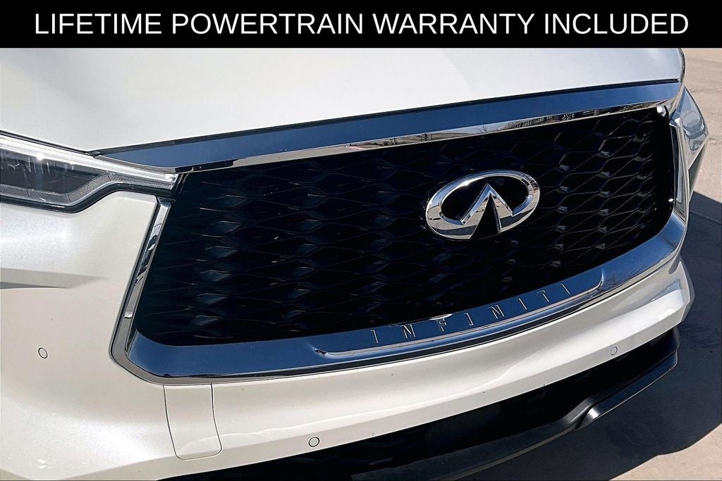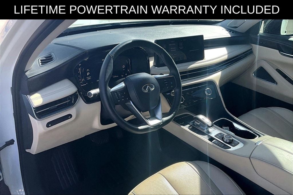 New Price! Recent Arrival! CARFAX One-Owner. Certified. Grubbs INFINITI offers this Market Priced Pre-Owned 2023 INFINITI QX60 Sensory in Majestic White with a premium Sandstone interior. Fully inspected and all Eligible Vehicles are backed by our exclusive Grubbs Lifetime Powertrain Warranty, it comes loaded with features including Cargo Package (Cargo Mat (Reversible) and First Aid Kit), INFINITI Certified Pre-Owned Certified, 17 Speakers, 3rd row seats: bench, 4-Wheel Disc Brakes, 4.334 Axle Ratio, ABS brakes, Air Conditioning, Alloy wheels, AM/FM radio: SiriusXM, Anti-whiplash front head restraints, Auto High-beam Headlights, Auto-dimming door mirrors, Auto-dimming Rear-View mirror, Automatic temperature control, Bose Performance Series 17-Speaker Sound System, Brake assist, Bumpers: body-color, Climate-Controlled Front Bucket Seats, Delay-off headlights, Driver door bin, Driver vanity mirror, Dual front impact airbags, Dual front side impact airbags, Electronic Stability Control, Emergency communication system, Floor Mats on Bench Seats w/3rd Row Tray, Four wheel independent suspension, Front anti-roll bar, Front Bucket Seats, Front Center Armrest, Front dual zone A/C, Front reading lights, Fully automatic headlights, Garage door transmitter: HomeLink, Heated door mirrors, Heated front seats, Heated rear seats, Heated steering wheel, Illuminated entry, Illuminated Kick Plate, Knee airbag, Leather Shift Knob, Leather steering wheel, Leather-Appointed Seating Surfaces, Literature Kit, Low tire pressure warning, Memory seat, Navigation system: INFINITI InTouch Navigation, Occupant sensing airbag, Outside temperature display, Overhead airbag, Overhead console, Panic alarm, Passenger door bin, Passenger vanity mirror, Power door mirrors, Power driver seat, Power Liftgate, Power moonroof, Power passenger seat, Power steering, Power windows, Radio data system, Radio: AM/FM Audio System, Rain sensing wipers, Rear air conditioning, Rear anti-roll bar, Rear reading lights, Rear seat center armrest, Rear side impact airbag, Rear window defroster, Rear window wiper, Reclining 3rd row seat, Remote keyless entry, Security system, Silver Cross Bar, Speed control, Speed-sensing steering, Speed-Sensitive Wipers, Splash Guards, Split folding rear seat, Spoiler, Steering wheel memory, Steering wheel mounted audio controls, Tachometer, Telescoping steering wheel, Tilt steering wheel, Traction control, Trip computer, Turn signal indicator mirrors, Variably intermittent wipers, Ventilated front seats, and Wheels: 20 x 8J Luxury Machined Aluminum Alloy. 2023 INFINITI QX60 Sensory 4D Sport Utility AWD 3.5L V6 9-Speed Automatic Majestic White Upgraded Wheel Package.
