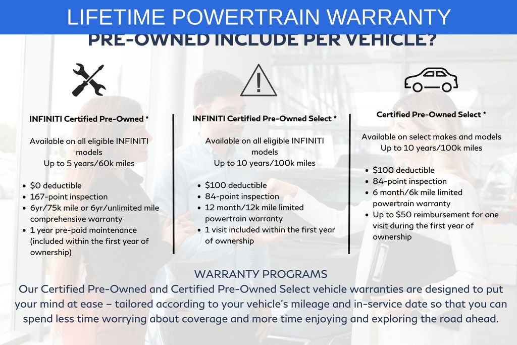 * 1-Year Prepaid Service Visit Included. 6 Year/75,000 Mile Warranty for Vehicles With Less Than 15,000 Miles at Time of Certification. 6 Year/Unlimited Mile Warranty for Vehicles with 15,001-60,000 Miles at Time of Certification. INFINITI ONLY Models Qualify.