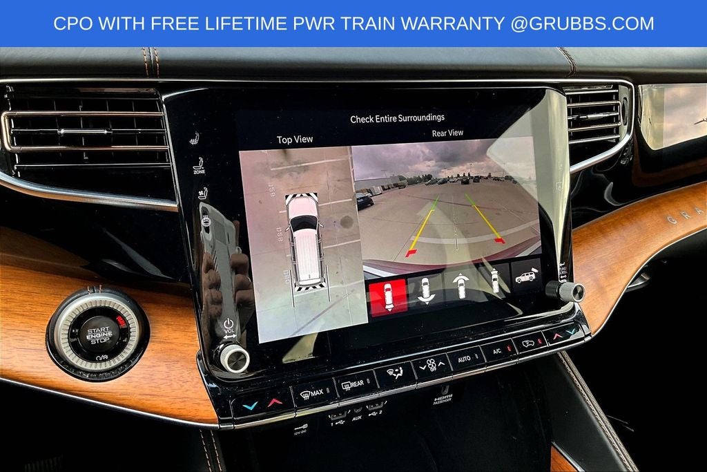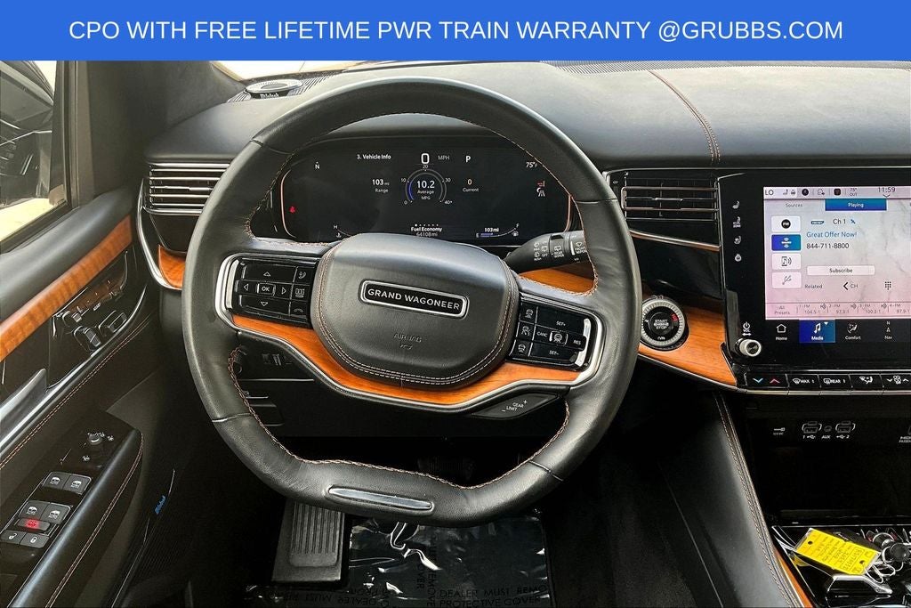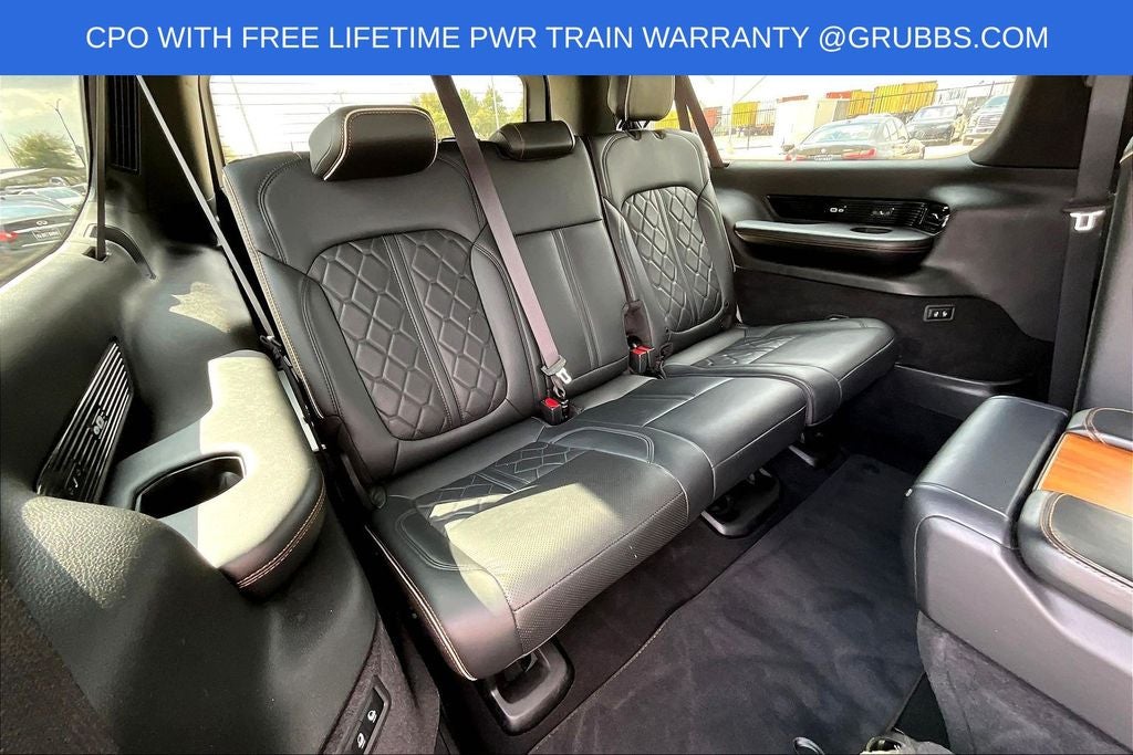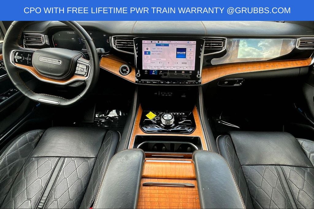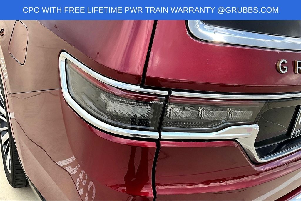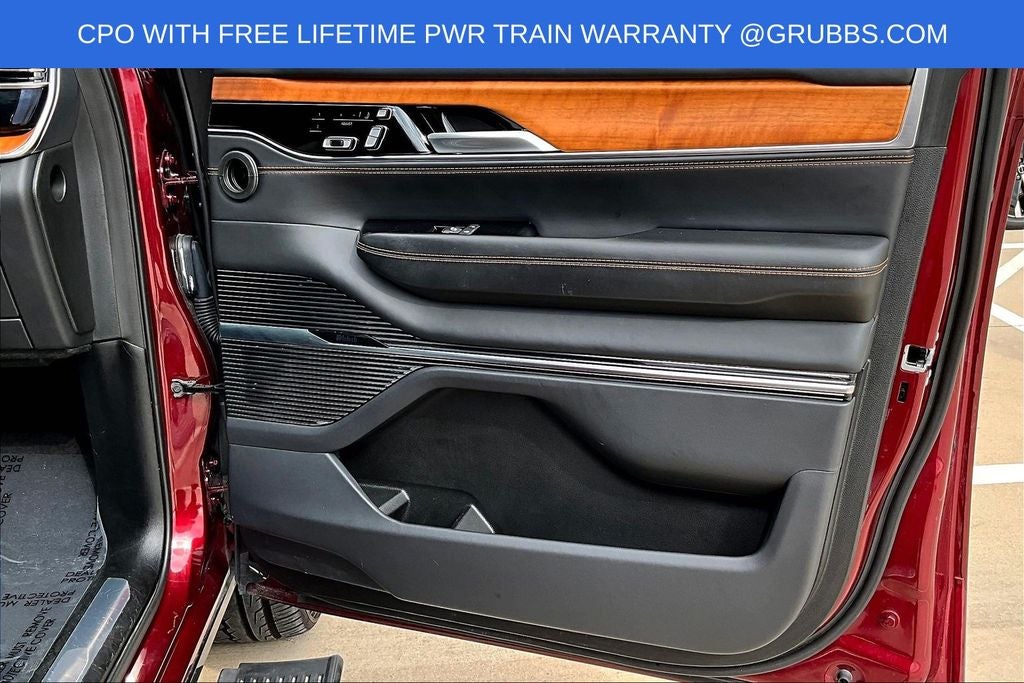 Grubbs INFINITI offers this Market Priced Pre-Owned 2024 Jeep Grand Wagoneer L Series III in Velvet Red Pearlcoat with a premium Global Black interior. Fully inspected and all Eligible Vehicles are backed by our exclusive Grubbs Lifetime Powertrain Warranty, it comes loaded with features including Quick Order Package 28W, Two Tone Paint Group, 3rd row seats: bench, 4-Wheel Disc Brakes, ABS brakes, Adjustable pedals, Air Conditioning, AM/FM radio: SiriusXM with 360L, Anti-whiplash front head restraints, Apple CarPlay/Android Auto, Audio memory, Auto High-beam Headlights, Auto-dimming door mirrors, Auto-dimming Rear-View mirror, Auto-leveling suspension, Automatic temperature control, Black Roof, Brake assist, Bumpers: body-color, Compass, Delay-off headlights, Driver door bin, Driver vanity mirror, Driver's Seat Mounted Armrest, Dual front impact airbags, Dual front side impact airbags, Electronic Stability Control, Emergency communication system, Fog lights, Four wheel independent suspension, Front anti-roll bar, Front Bucket Seats, Front Center Armrest w/Storage, Front dual zone A/C, Front reading lights, Fully automatic headlights, Garage door transmitter, Genuine wood console insert, Genuine wood dashboard insert, Genuine wood door panel insert, Heads-Up Display, Heated door mirrors, Heated front seats, Heated rear seats, Heated steering wheel, Illuminated entry, Knee airbag, Leather steering wheel, Low tire pressure warning, Memory seat, Navigation System, Night vision lights, Normal Duty Suspension, Occupant sensing airbag, Outside temperature display, Overhead airbag, Overhead console, Panic alarm, Passenger door bin, Passenger seat mounted armrest, Passenger vanity mirror, Pedal memory, Power adjustable front head restraints, Power door mirrors, Power driver seat, Power Liftgate, Power moonroof, Power passenger seat, Power steering, Power windows, Premium Leather Trimmed Bucket Seats, Radio data system, Radio: Uconnect 5 Nav w/12.0 Display, Rain sensing wipers, Rear air conditioning, Rear anti-roll bar, Rear dual zone A/C, Rear reading lights, Rear seat center armrest, Rear window defroster, Rear window wiper, Reclining 3rd row seat, Remote keyless entry, Roof rack, Security system, Speed control, Speed-sensing steering, Speed-Sensitive Wipers, Split folding rear seat, Steering wheel memory, Steering wheel mounted audio controls, Tachometer, Telescoping steering wheel, Tilt steering wheel, Traction control, Trip computer, Turn signal indicator mirrors, Variably intermittent wipers, Ventilated front seats, Ventilated rear seats, Voltmeter, and Wheels: 22 x 9.0 Premium 4 Aluminum.
