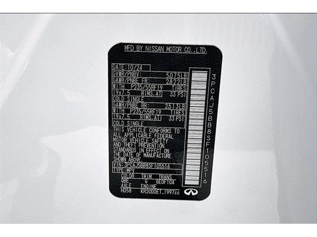 New Price! Certified. Grubbs INFINITI offers this Market Priced Pre-Owned 2025 INFINITI QX50 LUXE in Radiant White with a premium Graphite interior. Fully inspected and all Eligible Vehicles are backed by our exclusive Grubbs Lifetime Powertrain Warranty, it comes loaded with features including QX50 LUXE, 4D Sport Utility, I4, CVT, AWD, Radiant White, Graphite Leather, and Garage door transmitter: HomeLink QX50 LUXE, INFINITI Certified Pre-Owned Certified, 4D Sport Utility, I4, CVT, AWD, Radiant White, Graphite Leather, Garage door transmitter: HomeLink, 4-Wheel Disc Brakes, 6 Speakers, ABS brakes, Air Conditioning, AM/FM radio: SiriusXM, Auto High-beam Headlights, Auto-dimming Rear-View mirror, Automatic temperature control, Bose 12-Speaker Premium Audio, Brake assist, Bumpers: body-color, CD player, Cross Bars, Delay-off headlights, Driver door bin, Driver vanity mirror, Dual front impact airbags, Dual front side impact airbags, Electronic Stability Control, Emergency communication system: INFINITI InTouch (1-year complimentary trial), Exterior Parking Camera Rear, Floor Mats, Four wheel independent suspension, Front anti-roll bar, Front Bucket Seats, Front Center Armrest, Front dual zone A/C, Front reading lights, Fully automatic headlights, Heated door mirrors, Heated Front Bucket Seats, Heated front seats, Illuminated entry, Illuminated Kick Plates, Knee airbag, Leather Shift Knob, Leather steering wheel, Leather-Appointed Seat Trim, Literature Kit, Low tire pressure warning, Memory seat, Occupant sensing airbag, Outside temperature display, Overhead airbag, Overhead console, Panic alarm, Passenger vanity mirror, Power door mirrors, Power driver seat, Power Liftgate, Power moonroof, Power passenger seat, Power steering, Power windows, Radio data system, Radio: HD Audio System, Rear anti-roll bar, Rear Parking Sensors, Rear reading lights, Rear seat center armrest, Rear side impact airbag, Rear window defroster, Rear window wiper, Remote keyless entry, Security system, Speed control, Speed-sensing steering, Speed-Sensitive Wipers, Splash Guards (Set of 4), Split folding rear seat, Spoiler, Steering wheel mounted audio controls, Tachometer, Telescoping steering wheel, Tilt steering wheel, Traction control, Trip computer, Turn signal indicator mirrors, Variably intermittent wipers, and Wheels: 19 Silver Painted Aluminum Alloy. 2025 INFINITI QX50 LUXE 4D Sport Utility AWD I4 CVT Radiant White QX50 LUXE, 4D Sport Utility, I4, CVT, AWD, Radiant White, Graphite Leather, Garage door transmitter: HomeLink.