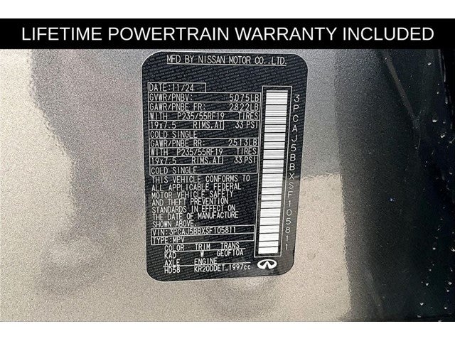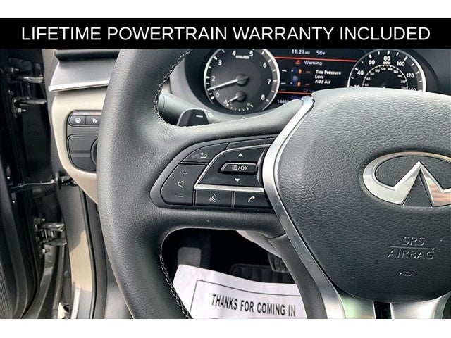 New Price! Certified. Grubbs INFINITI offers this Market Priced Pre-Owned 2025 INFINITI QX50 LUXE in Graphite Shadow with a premium Gray interior. Fully inspected and all Eligible Vehicles are backed by our exclusive Grubbs Lifetime Powertrain Warranty, it comes loaded with features including INFINITI Certified Pre-Owned Certified, 4-Wheel Disc Brakes, 6 Speakers, ABS brakes, Air Conditioning, Alloy wheels, AM/FM radio: SiriusXM, Auto High-beam Headlights, Auto-dimming Rear-View mirror, Automatic temperature control, Brake assist, Bumpers: body-color, CD player, Delay-off headlights, Driver door bin, Driver vanity mirror, Dual front impact airbags, Dual front side impact airbags, Electronic Stability Control, Emergency communication system: INFINITI InTouch (1-year complimentary trial), Exterior Parking Camera Rear, Floor Mats, Four wheel independent suspension, Front anti-roll bar, Front Bucket Seats, Front Center Armrest, Front dual zone A/C, Front reading lights, Fully automatic headlights, Garage door transmitter: HomeLink, Heated door mirrors, Heated Front Bucket Seats, Heated front seats, Illuminated entry, Illuminated Kick Plates, Knee airbag, Leather Shift Knob, Leather steering wheel, Leather-Appointed Seat Trim, Literature Kit, Low tire pressure warning, Memory seat, Occupant sensing airbag, Outside temperature display, Overhead airbag, Overhead console, Panic alarm, Passenger door bin, Passenger vanity mirror, Power door mirrors, Power driver seat, Power Liftgate, Power moonroof, Power passenger seat, Power steering, Power windows, Radio data system, Radio: HD Audio System, Rear anti-roll bar, Rear Parking Sensors, Rear reading lights, Rear seat center armrest, Rear side impact airbag, Rear window defroster, Rear window wiper, Remote keyless entry, Security system, Speed control, Speed-sensing steering, Speed-Sensitive Wipers, Splash Guards (Set of 4), Split folding rear seat, Spoiler, Steering wheel mounted audio controls, Tachometer, Telescoping steering wheel, Tilt steering wheel, Traction control, Trip computer, Turn signal indicator mirrors, Variably intermittent wipers, and Wheels: 19 Silver Painted Aluminum Alloy. 2025 INFINITI QX50 LUXE 4D Sport Utility AWD I4 CVT Graphite Shadow