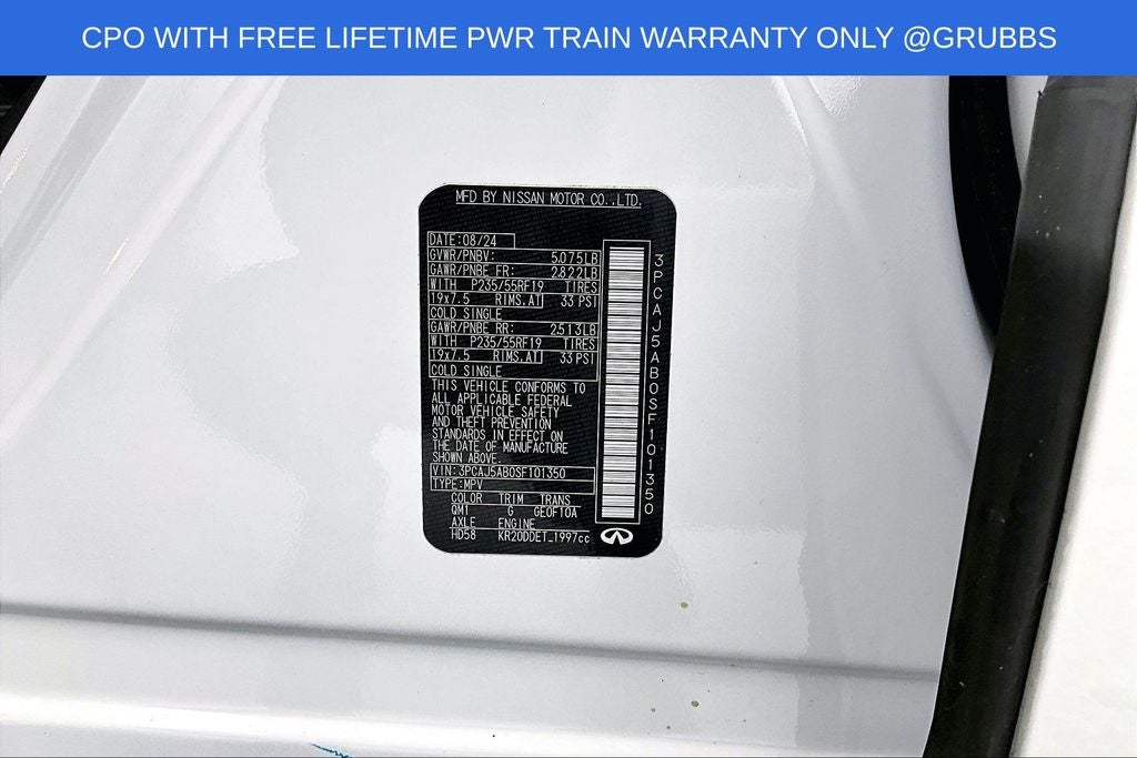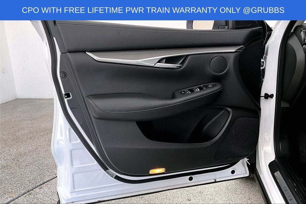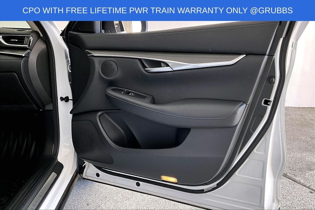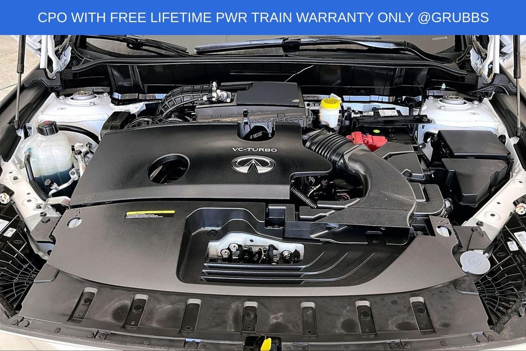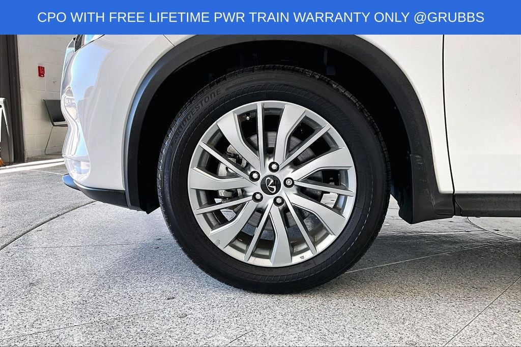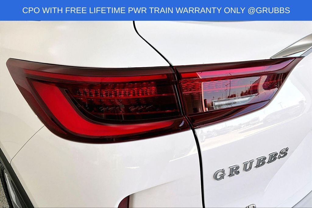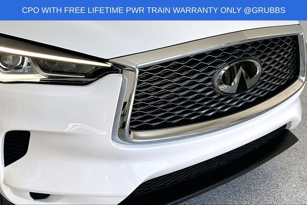 Grubbs INFINITI offers this Market Priced Pre-Owned 2025 INFINITI QX50 PURE in Lunar White with a premium Graphite interior. Fully inspected and all Eligible Vehicles are backed by our exclusive Grubbs Lifetime Powertrain Warranty, it comes loaded with features including Auto-dimming Rear-View mirror, Automatic temperature control, Fully automatic headlights, Panic alarm, Power driver seat, Power Liftgate, Radio: HD Audio System, Speed-Sensitive Wipers, Steering wheel mounted audio controls, and Wheels: 19 Silver Painted Aluminum Alloy INFINITI Certified Pre-Owned Certified, Auto-dimming Rear-View mirror, Automatic temperature control, Fully automatic headlights, Panic alarm, Power driver seat, Power Liftgate, Radio: HD Audio System, Speed-Sensitive Wipers, Steering wheel mounted audio controls, Wheels: 19 Silver Painted Aluminum Alloy, 4-Wheel Disc Brakes, 6 Speakers, ABS brakes, Air Conditioning, Alloy wheels, AM/FM radio: SiriusXM, Auto High-beam Headlights, Brake assist, Bumpers: body-color, CD player, Delay-off headlights, Driver door bin, Driver vanity mirror, Dual front impact airbags, Dual front side impact airbags, Electronic Stability Control, Emergency communication system: INFINITI InTouch (1-year complimentary trial), Exterior Parking Camera Rear, Floor Mats, Four wheel independent suspension, Front anti-roll bar, Front Bucket Seats, Front Center Armrest, Front dual zone A/C, Front reading lights, Heated door mirrors, Illuminated entry, Knee airbag, Leather Shift Knob, Leather steering wheel, Leatherette Seat Trim, Literature Kit, Low tire pressure warning, Occupant sensing airbag, Outside temperature display, Overhead airbag, Overhead console, Passenger door bin, Passenger vanity mirror, Power door mirrors, Power passenger seat, Power steering, Power windows, Radio data system, Rear anti-roll bar, Rear Parking Sensors, Rear reading lights, Rear seat center armrest, Rear side impact airbag, Rear window defroster, Rear window wiper, Remote keyless entry, Security system, Speed control, Speed-sensing steering, Splash Guards (Set of 4), Split folding rear seat, Spoiler, Tachometer, Telescoping steering wheel, Tilt steering wheel, Traction control, Trip computer, Turn signal indicator mirrors, and Variably intermittent wipers. Auto-dimming Rear-View mirror, Automatic temperature control, Fully automatic headlights, Panic alarm, Power driver seat, Power Liftgate, Radio: HD Audio System, Speed-Sensitive Wipers, Steering wheel mounted audio controls, Wheels: 19 Silver Painted Aluminum Alloy.
