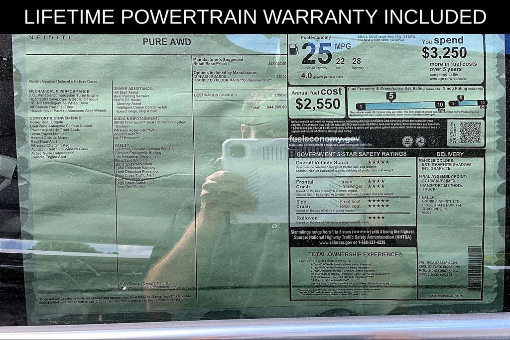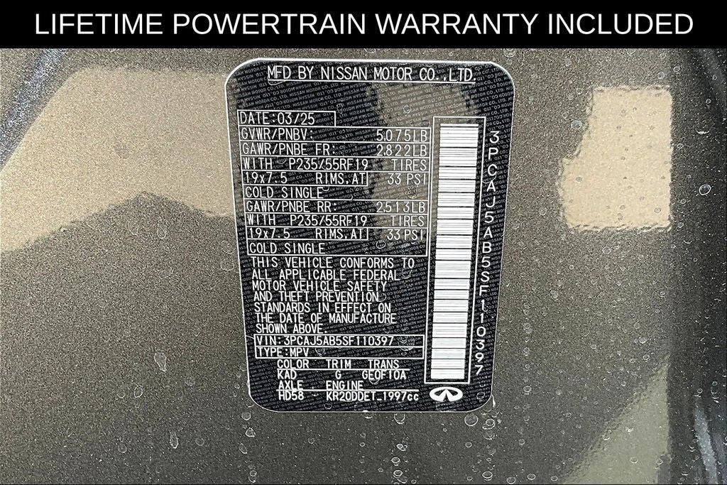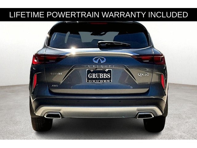 Grubbs INFINITI The only Authorized INFINITI Dealer in Grapevine. With one of the largest New and Pre-Owned INFINITI Selection in the area. This 2025 INFINITI QX50 PURE comes with 3 Year INFINITI Recommended Maintenance Included at no charge and is loaded with the following Factory Options: 4-Wheel Disc Brakes, 6 Speakers, ABS brakes, Air Conditioning, Alloy wheels, AM/FM radio: SiriusXM, Auto High-beam Headlights, Auto-dimming Rear-View mirror, Automatic temperature control, Brake assist, Bumpers: body-color, CD player, Delay-off headlights, Driver door bin, Driver vanity mirror, Dual front impact airbags, Dual front side impact airbags, Electronic Stability Control, Emergency communication system: INFINITI InTouch (1-year complimentary trial), Exterior Parking Camera Rear, Four wheel independent suspension, Front anti-roll bar, Front Bucket Seats, Front Center Armrest, Front dual zone A/C, Front reading lights, Fully automatic headlights, Heated door mirrors, Illuminated entry, Knee airbag, Leather Shift Knob, Leather steering wheel, Leatherette Seat Trim, Low tire pressure warning, Occupant sensing airbag, Outside temperature display, Overhead airbag, Overhead console, Panic alarm, Passenger door bin, Passenger vanity mirror, Power door mirrors, Power driver seat, Power Liftgate, Power passenger seat, Power steering, Power windows, Radio data system, Radio: HD Audio System, Rear anti-roll bar, Rear Parking Sensors, Rear reading lights, Rear seat center armrest, Rear side impact airbag, Rear window defroster, Rear window wiper, Remote keyless entry, Security system, Speed control, Speed-sensing steering, Speed-Sensitive Wipers, Split folding rear seat, Spoiler, Steering wheel mounted audio controls, Tachometer, Telescoping steering wheel, Tilt steering wheel, Traction control, Trip computer, Turn signal indicator mirrors, Variably intermittent wipers, and Wheels: 19 Silver Painted Aluminum Alloy!!