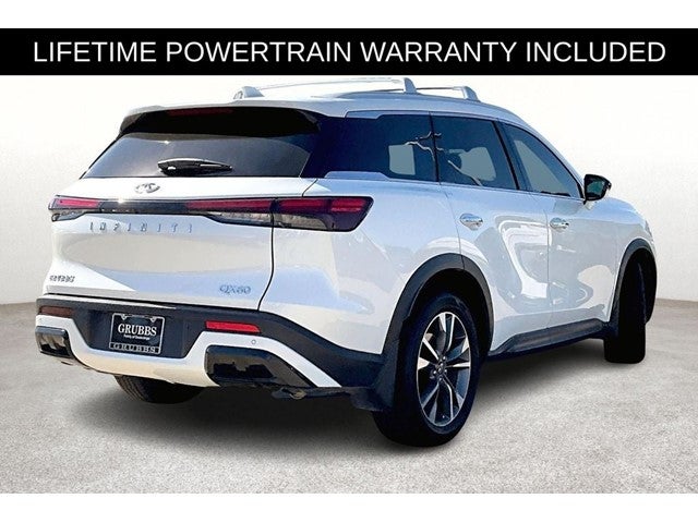 Grubbs INFINITI The only Authorized INFINITI Dealer in Grapevine. With one of the largest New and Pre-Owned INFINITI Selection in the area. This 2025 INFINITI QX60 LUXE comes with 3 Year INFINITI Recommended Maintenance Included at no charge and is loaded with the following Factory Options: Lighting Package (N94), 17 Speakers, 3rd row seats: bench, 4-Wheel Disc Brakes, ABS brakes, Air Conditioning, Alloy wheels, AM/FM radio: SiriusXM, Anti-whiplash front head restraints, Apple CarPlay/Android Auto, Auto High-beam Headlights, Auto tilt-away steering wheel, Auto-dimming door mirrors, Auto-dimming Rear-View mirror, Automatic temperature control, Bose Performance Series 17-Speaker Sound System, Brake assist, Bumpers: body-color, Climate Controlled Front Bucket Seats, Delay-off headlights, Driver door bin, Driver vanity mirror, Dual front impact airbags, Dual front side impact airbags, Electronic Stability Control, Emergency communication system: INFINITI InTouch, Exterior Parking Camera Rear, Floor Mats w/Bench Seats on 3rd Row Tray, Four wheel independent suspension, Front anti-roll bar, Front Bucket Seats, Front Center Armrest, Front dual zone A/C, Front reading lights, Fully automatic headlights, Garage door transmitter: HomeLink, Heated door mirrors, Heated front seats, Heated rear seats, Heated steering wheel, Illuminated entry, Knee airbag, Leather Shift Knob, Leather steering wheel, Leather-Appointed Seating Surfaces, Literature Kit, Low tire pressure warning, Memory seat, Navigation system: INFINITI InTouch Navigation, Occupant sensing airbag, Outside temperature display, Overhead airbag, Overhead console, Panic alarm, Passenger door bin, Passenger vanity mirror, Power door mirrors, Power driver seat, Power Liftgate, Power moonroof, Power passenger seat, Power steering, Power windows, Premium Paint, Radio data system, Radio: Bose Performance Series, Rain sensing wipers, Rear air conditioning, Rear anti-roll bar, Rear reading lights, Rear seat center armrest, Rear side impact airbag, Rear window defroster, Rear window wiper, Reclining 3rd row seat, Remote keyless entry, Security system, Silver Cross Bar, Speed control, Speed-sensing steering, Speed-Sensitive Wipers, Splash Guards, Split folding rear seat, Spoiler, Steering wheel memory, Steering wheel mounted audio controls, Tachometer, Telescoping steering wheel, Tilt steering wheel, Traction control, Trip computer, Turn signal indicator mirrors, Variably intermittent wipers, Ventilated front seats, and Wheels: 20 x 8J Sporty Machined Aluminum Alloy!!