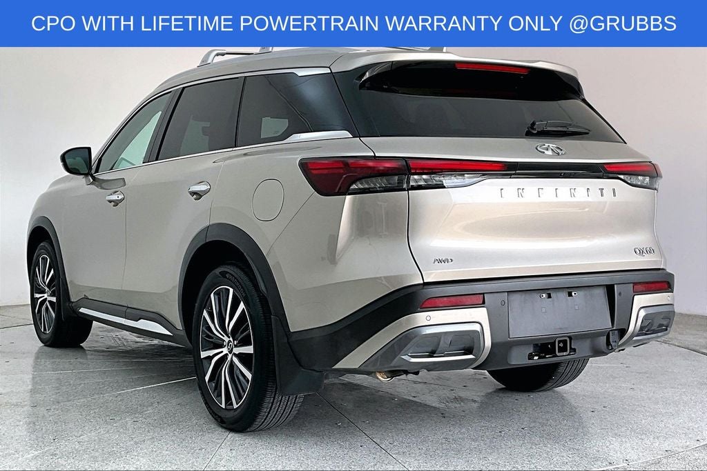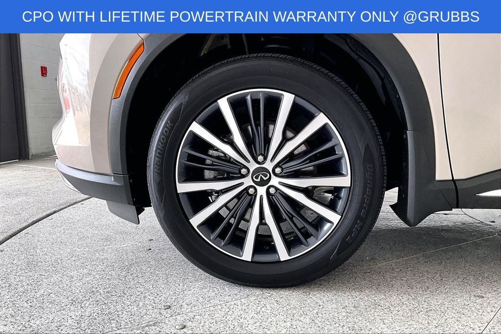 Grubbs INFINITI offers this Market Priced Pre-Owned 2025 INFINITI QX60 Sensory in Warm Titanium with a premium Graphite interior. Fully inspected and all Eligible Vehicles are backed by our exclusive Grubbs Lifetime Powertrain Warranty, it comes loaded with features including INFINITI Certified Pre-Owned Certified, Automatic temperature control, Exterior Parking Camera Rear, Garage door transmitter: HomeLink, Heated front seats, Heated steering wheel, Leather-Appointed Seating Surfaces, Memory seat, Navigation system: INFINITI InTouch Navigation, Power Liftgate, Power moonroof, Security system, Ventilated front seats, 17 Speakers, 3rd row seats: bench, 4-Wheel Disc Brakes, ABS brakes, Air Conditioning, Alloy wheels, AM/FM radio: SiriusXM, Auto High-beam Headlights, Auto tilt-away steering wheel, Auto-dimming door mirrors, Auto-dimming Rear-View mirror, Brake assist, Delay-off headlights, Driver door bin, Driver vanity mirror, Dual front impact airbags, Dual front side impact airbags, Electronic Stability Control, Four wheel independent suspension, Front anti-roll bar, Front Bucket Seats, Front dual zone A/C, Front reading lights, Fully automatic headlights, Heated door mirrors, Heated rear seats, Illuminated entry, Knee airbag, Leather Shift Knob, Leather steering wheel, Low tire pressure warning, Occupant sensing airbag, Outside temperature display, Overhead airbag, Overhead console, Panic alarm, Passenger door bin, Passenger vanity mirror, Power door mirrors, Power driver seat, Power passenger seat, Power steering, Power windows, Radio data system, Rain sensing wipers, Rear air conditioning, Rear anti-roll bar, Rear reading lights, Rear side impact airbag, Rear window defroster, Rear window wiper, Reclining 3rd row seat, Remote keyless entry, Speed control, Speed-sensing steering, Speed-Sensitive Wipers, Split folding rear seat, Spoiler, Steering wheel memory, Steering wheel mounted audio controls, Tachometer, Telescoping steering wheel, Tilt steering wheel, Traction control, Trip computer, Turn signal indicator mirrors, and Variably intermittent wipers. 2025 INFINITI QX60 Sensory