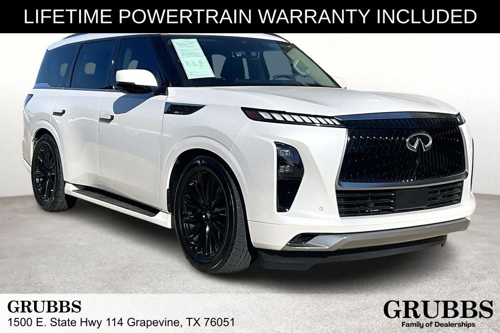 Grubbs INFINITI The only Authorized INFINITI Dealer in Grapevine. With one of the largest New and Pre-Owned INFINITI Selection in the area. This 2025 INFINITI QX80 LUXE comes with 3 Year INFINITI Recommended Maintenance Included at no charge and is loaded with the following Factory Options: Split Bench Seat Package, 14 Speakers, 3rd row seats: bench, 4-Wheel Disc Brakes, ABS brakes, Adaptive suspension, Air Conditioning, Alloy wheels, AM/FM radio: SiriusXM with 360L, Anti-whiplash front head restraints, Apple CarPlay/Android Auto, Audio memory, Auto High-beam Headlights, Auto tilt-away steering wheel, Auto-dimming door mirrors, Auto-dimming Rear-View mirror, Auto-leveling suspension, Automatic temperature control, Brake assist, Bumpers: body-color, Center Front Spoiler, Climate Controlled Front Bucket Seats, Compass, Delay-off headlights, Driver door bin, Driver vanity mirror, Dual front impact airbags, Dual front side impact airbags, Electronic Stability Control, Emergency communication system: INFINITI InTouch, Four wheel independent suspension, Front anti-roll bar, Front Bucket Seats, Front Center Armrest, Front dual zone A/C, Front reading lights, Fully automatic headlights, Garage door transmitter: myQ Connected Garage, Heads-Up Display, Heated door mirrors, Heated front seats, Heated rear seats, Heated steering wheel, HVAC memory, Illuminated entry, Knee airbag, Leather Seating Surfaces, Leather steering wheel, Literature Kit, Low tire pressure warning, Memory seat, Navigation system: Google Built-in, Occupant sensing airbag, Outside temperature display, Overhead airbag, Overhead console, Panic alarm, Passenger door bin, Passenger vanity mirror, Power door mirrors, Power driver seat, Power Liftgate, Power moonroof, Power passenger seat, Power steering, Power windows, Radiant Front & Rear Doors Illuminated Kick Plates, Radio data system, Radio: Klipsch Premium Audio System w/14 Speakers, Rain sensing wipers, Rear air conditioning, Rear anti-roll bar, Rear reading lights, Rear seat center armrest, Rear window defroster, Rear window wiper, Reclining 3rd row seat, Remote keyless entry, Security system, Speed control, Speed-sensing steering, Split folding rear seat, Spoiler, Steering wheel memory, Steering wheel mounted audio controls, Super Premium Paint, Tachometer, Telescoping steering wheel, Tilt steering wheel, Traction control, Trip computer, Turn signal indicator mirrors, Variably intermittent wipers, Ventilated front seats, Ventilated rear seats, and Wheels: 22 x 8 Cast Aluminum Alloy!!
