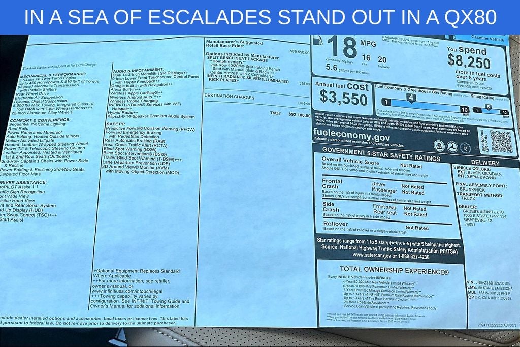 Grubbs INFINITI offers this Market Priced Pre-Owned 2025 INFINITI QX80 LUXE in Coulis Red with a premium Sepia Brown interior. Fully inspected and all Eligible Vehicles are backed by our exclusive Grubbs Lifetime Powertrain Warranty, it comes loaded with features including Split Bench Seat Package, INFINITI Certified Pre-Owned Certified, 3rd row seats: bench, 4-Wheel Disc Brakes, ABS brakes, Adaptive suspension, Air Conditioning, AM/FM radio: SiriusXM with 360L, Anti-whiplash front head restraints, Apple CarPlay/Android Auto, Audio memory, Auto High-beam Headlights, Auto tilt-away steering wheel, Auto-dimming door mirrors, Auto-dimming Rear-View mirror, Auto-leveling suspension, Automatic temperature control, Brake assist, Bumpers: body-color, Center Front Spoiler, Climate Controlled Front Bucket Seats, Compass, Delay-off headlights, Driver door bin, Driver vanity mirror, Dual front impact airbags, Dual front side impact airbags, Electronic Stability Control, Emergency communication system: INFINITI InTouch, Four wheel independent suspension, Front anti-roll bar, Front Bucket Seats, Front Center Armrest, Front dual zone A/C, Front reading lights, Fully automatic headlights, Garage door transmitter: myQ Connected Garage, Heads-Up Display, Heated door mirrors, Heated front seats, Heated rear seats, Heated steering wheel, HVAC memory, Illuminated entry, Knee airbag, Leather Seating Surfaces, Leather steering wheel, Literature Kit, Low tire pressure warning, Memory seat, Navigation system: Google Built-in, Occupant sensing airbag, Outside temperature display, Overhead airbag, Overhead console, Panic alarm, Passenger vanity mirror, Power door mirrors, Power driver seat, Power Liftgate, Power moonroof, Power passenger seat, Power steering, Power windows, Premium Paint, ProPILOT Assist 2.1 (LUXE Grade), Radiant Front & Rear Doors Illuminated Kick Plates, Radio: Klipsch Premium Audio System w/14 Speakers, Rain sensing wipers, Rear air conditioning, Rear anti-roll bar, Rear reading lights, Rear seat center armrest, Rear window defroster, Rear window wiper, Reclining 3rd row seat, Remote keyless entry, Security system, Speed control, Speed-sensing steering, Split folding rear seat, Spoiler, Steering wheel memory, Steering wheel mounted audio controls, Tachometer, Telescoping steering wheel, Tilt steering wheel, Traction control, Trip computer, Turn signal indicator mirrors, Variably intermittent wipers, Ventilated front seats, Ventilated rear seats, and Wheels: 22 x 8 Cast Aluminum Alloy.