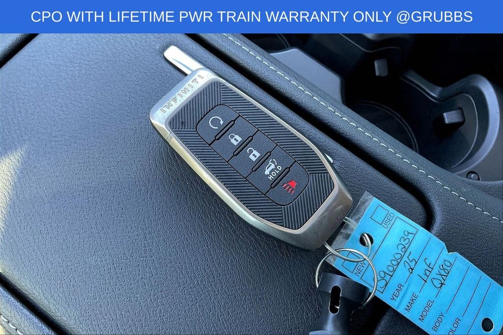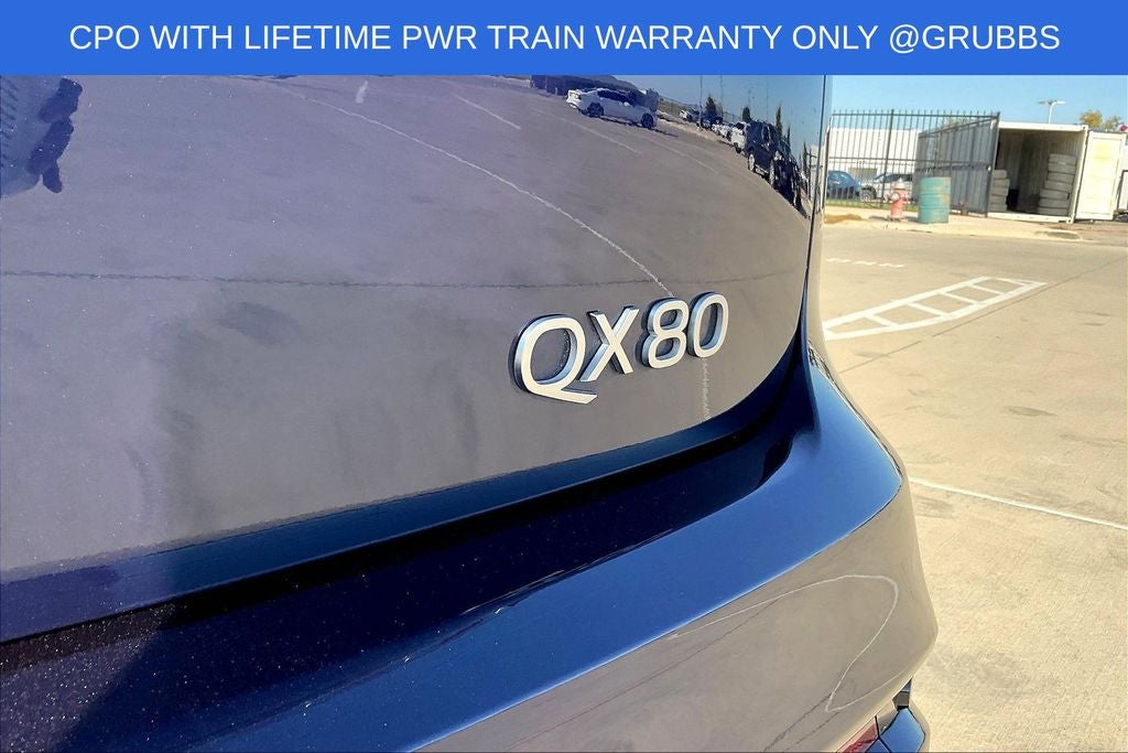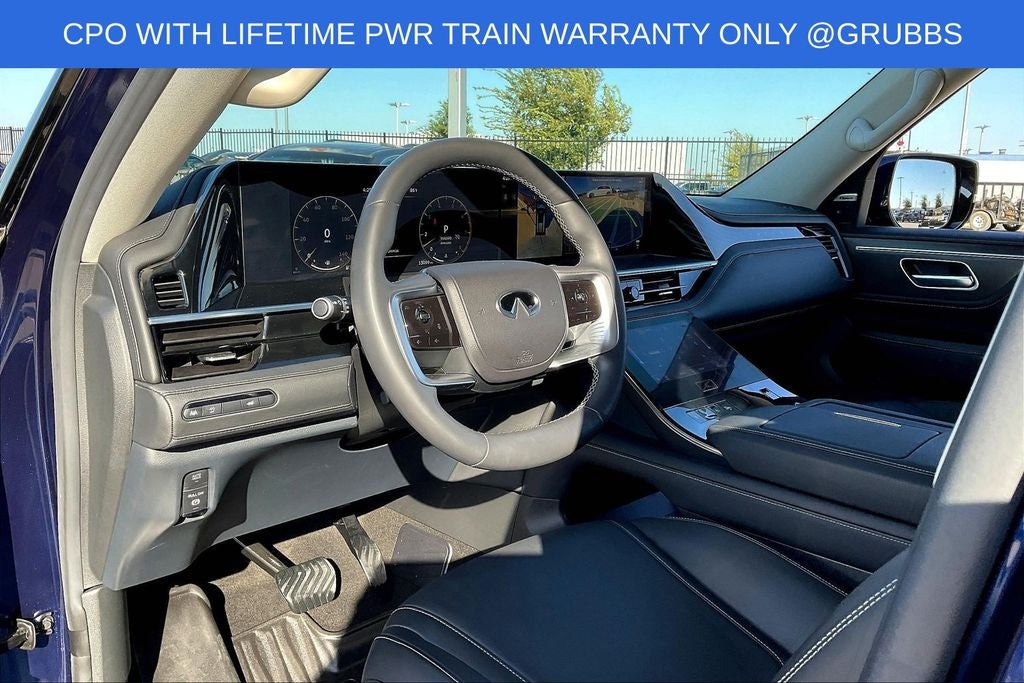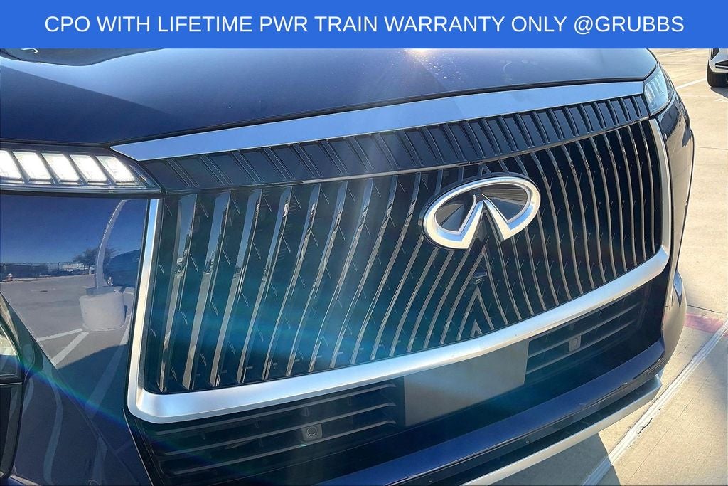 Grubbs INFINITI offers this Market Priced Pre-Owned 2025 INFINITI QX80 PURE in Grand Blue with a premium Graphite interior. Fully inspected and all Eligible Vehicles are backed by our exclusive Grubbs Lifetime Powertrain Warranty, it comes loaded with features including INFINITI Certified Pre-Owned Certified, 20 x 8 Aluminum Alloy Wheels, 3rd row seats: bench, 4-Wheel Disc Brakes, ABS brakes, Air Conditioning, Anti-whiplash front head restraints, Apple CarPlay/Android Auto, Audio memory, Auto High-beam Headlights, Auto tilt-away steering wheel, Auto-dimming door mirrors, Auto-dimming Rear-View mirror, Automatic temperature control, Brake assist, Bumpers: body-color, Center Front Spoiler, Compass, Delay-off headlights, Driver door bin, Driver vanity mirror, Dual front impact airbags, Dual front side impact airbags, Electronic Stability Control, Emergency communication system: INFINITI InTouch, Four wheel independent suspension, Front anti-roll bar, Front Bucket Seats, Front Center Armrest, Front dual zone A/C, Front reading lights, Fully automatic headlights, Garage door transmitter: myQ Connected Garage, Heated door mirrors, Heated Front Bucket Seats, Heated front seats, Heated rear seats, Heated steering wheel, HVAC memory, Illuminated entry, Knee airbag, Leather steering wheel, Literature Kit, Low tire pressure warning, Memory seat, Navigation system: Google Built-in, Occupant sensing airbag, Outside temperature display, Overhead airbag, Overhead console, Panic alarm, Passenger door bin, Passenger vanity mirror, Power door mirrors, Power driver seat, Power Liftgate, Power moonroof, Power passenger seat, Power steering, Power windows, Premium Paint, Radio: Klipsch Premium Audio System w/14 Speakers, Rain sensing wipers, Rear air conditioning, Rear anti-roll bar, Rear reading lights, Rear seat center armrest, Rear window defroster, Rear window wiper, Reclining 3rd row seat, Remote keyless entry, Security system, Speed control, Speed-sensing steering, Split folding rear seat, Spoiler, Steering wheel memory, Steering wheel mounted audio controls, Tachometer, TailorFit-Appointed Seating Surfaces, Telescoping steering wheel, Tilt steering wheel, Traction control, Trip computer, Turn signal indicator mirrors, and Variably intermittent wipers.