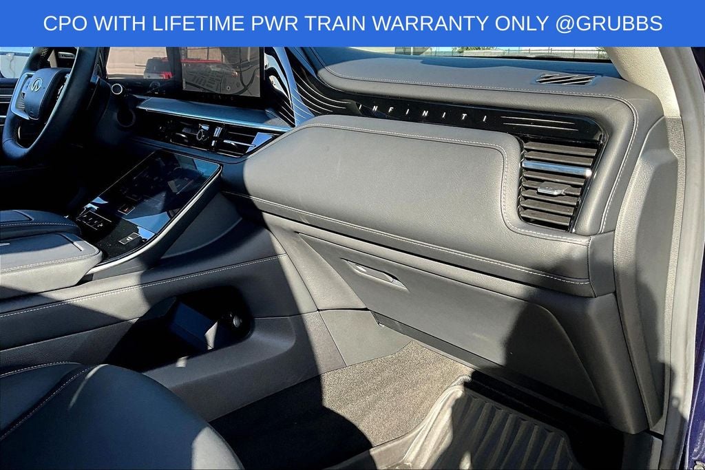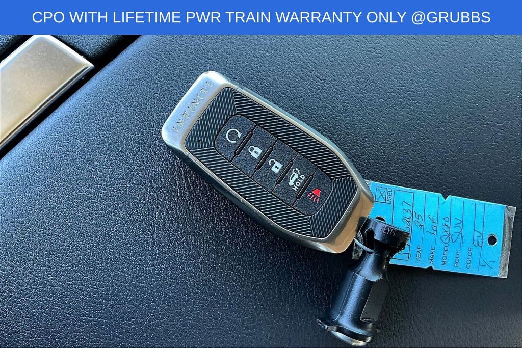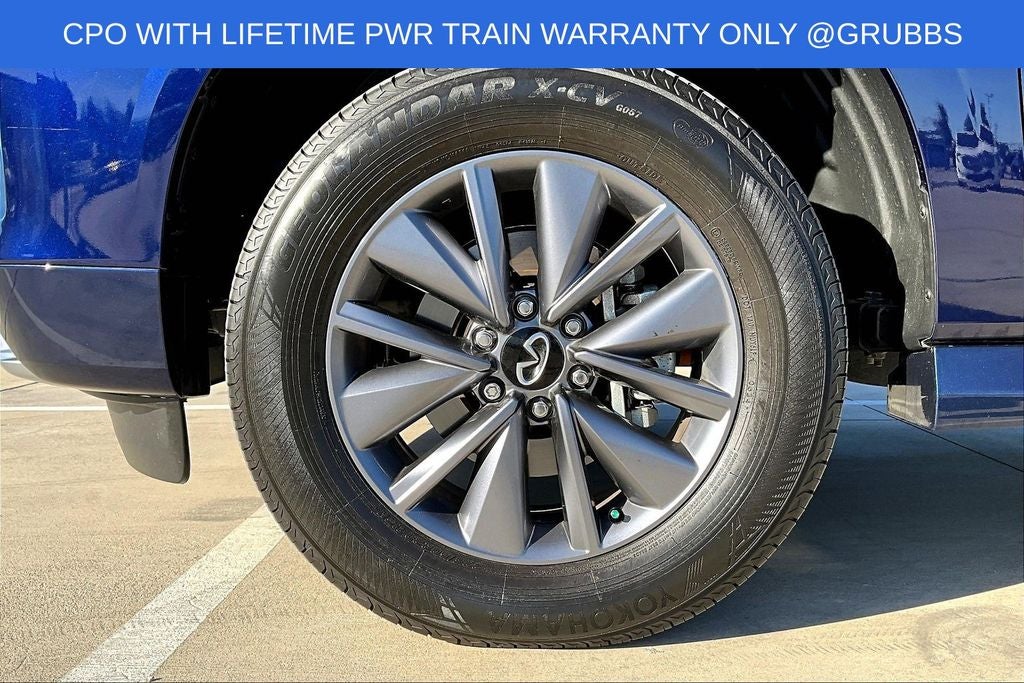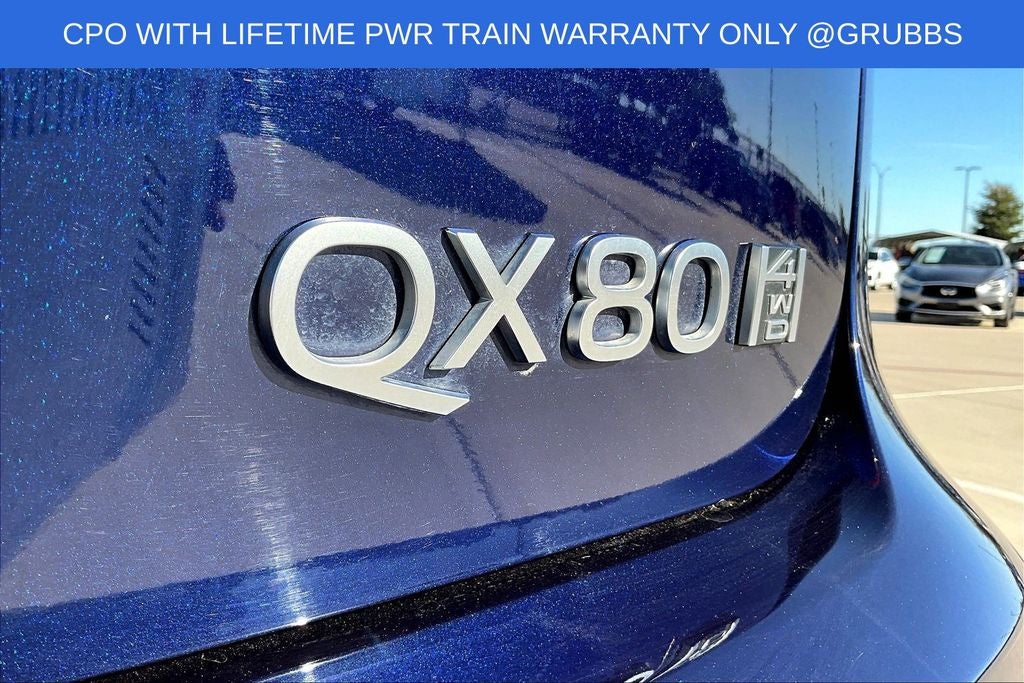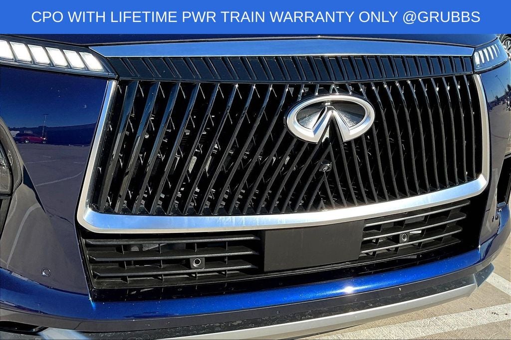 Grubbs INFINITI offers this Market Priced Pre-Owned 2025 INFINITI QX80 PURE in Grand Blue with a premium Graphite interior. Fully inspected and all Eligible Vehicles are backed by our exclusive Grubbs Lifetime Powertrain Warranty, it comes loaded with features including Garage door transmitter: myQ Connected Garage INFINITI Certified Pre-Owned Certified, Garage door transmitter: myQ Connected Garage, 14 Speakers, 20 x 8 Aluminum Alloy Wheels, 3rd row seats: bench, 4-Wheel Disc Brakes, ABS brakes, Air Conditioning, AM/FM radio: SiriusXM with 360L, Anti-whiplash front head restraints, Apple CarPlay/Android Auto, Audio memory, Auto High-beam Headlights, Auto tilt-away steering wheel, Auto-dimming door mirrors, Auto-dimming Rear-View mirror, Automatic temperature control, Brake assist, Bumpers: body-color, Center Front Spoiler, Compass, Delay-off headlights, Driver door bin, Driver vanity mirror, Dual front impact airbags, Dual front side impact airbags, Electronic Stability Control, Emergency communication system: INFINITI InTouch, Four wheel independent suspension, Front anti-roll bar, Front Bucket Seats, Front Center Armrest, Front dual zone A/C, Front reading lights, Fully automatic headlights, Heated door mirrors, Heated Front Bucket Seats, Heated front seats, Heated rear seats, Heated steering wheel, HVAC memory, Illuminated entry, Knee airbag, Leather steering wheel, Literature Kit, Low tire pressure warning, Memory seat, Navigation system: Google Built-in, Occupant sensing airbag, Outside temperature display, Overhead airbag, Overhead console, Panic alarm, Passenger door bin, Passenger vanity mirror, Power door mirrors, Power driver seat, Power Liftgate, Power moonroof, Power passenger seat, Power steering, Power windows, Premium Paint, Radio data system, Radio: Klipsch Premium Audio System w/14 Speakers, Rain sensing wipers, Rear air conditioning, Rear anti-roll bar, Rear reading lights, Rear seat center armrest, Rear window defroster, Rear window wiper, Reclining 3rd row seat, Remote keyless entry, Security system, Speed control, Speed-sensing steering, Split folding rear seat, Spoiler, Steering wheel memory, Steering wheel mounted audio controls, Tachometer, TailorFit-Appointed Seating Surfaces, Telescoping steering wheel, Tilt steering wheel, Traction control, Trip computer, Turn signal indicator mirrors, and Variably intermittent wipers. Garage door transmitter: myQ Connected Garage.