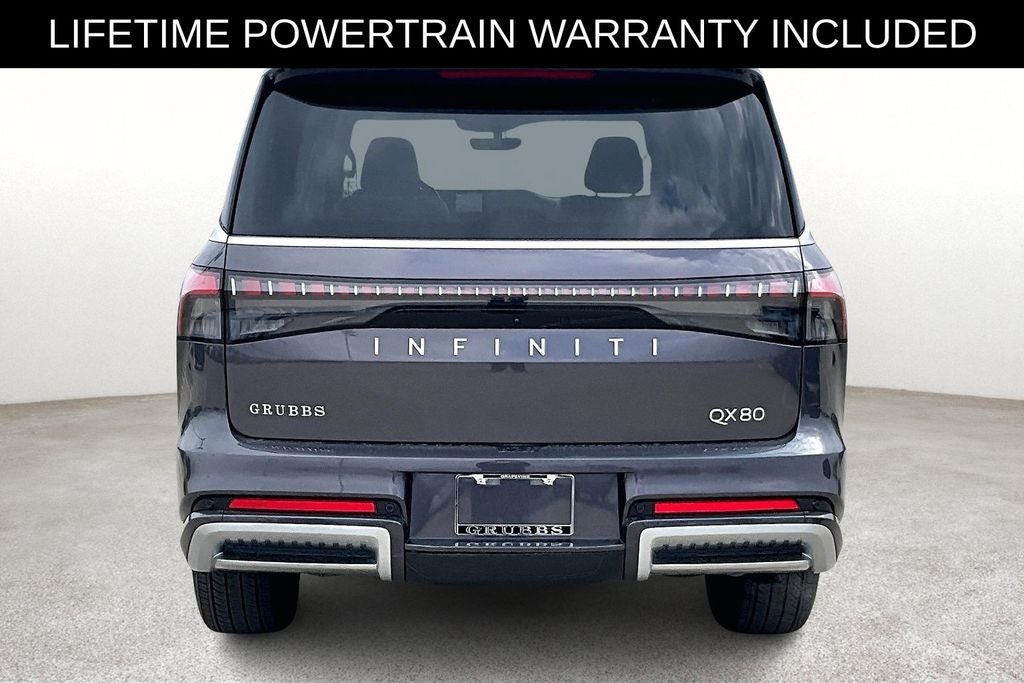 New Price! Certified. Grubbs INFINITI offers this Market Priced Pre-Owned 2025 INFINITI QX80 PURE in Anthracite Gray with a premium Graphite interior. Fully inspected and all Eligible Vehicles are backed by our exclusive Grubbs Lifetime Powertrain Warranty, it comes loaded with features including INFINITI Certified Pre-Owned Certified, 14 Speakers, 20 x 8 Aluminum Alloy Wheels, 3rd row seats: bench, 4-Wheel Disc Brakes, ABS brakes, Air Conditioning, Alloy wheels, AM/FM radio: SiriusXM with 360L, Anti-whiplash front head restraints, Apple CarPlay/Android Auto, Audio memory, Auto High-beam Headlights, Auto tilt-away steering wheel, Auto-dimming door mirrors, Auto-dimming Rear-View mirror, Automatic temperature control, Brake assist, Bumpers: body-color, Compass, Delay-off headlights, Driver door bin, Driver vanity mirror, Dual front impact airbags, Dual front side impact airbags, Electronic Stability Control, Emergency communication system: INFINITI InTouch, Four wheel independent suspension, Front anti-roll bar, Front Bucket Seats, Front Center Armrest, Front dual zone A/C, Front reading lights, Fully automatic headlights, Garage door transmitter: myQ Connected Garage, Heated door mirrors, Heated Front Bucket Seats, Heated front seats, Heated rear seats, Heated steering wheel, HVAC memory, Illuminated entry, Knee airbag, Leather steering wheel, Low tire pressure warning, Memory seat, Navigation system: Google Built-in, Occupant sensing airbag, Outside temperature display, Overhead airbag, Overhead console, Panic alarm, Passenger door bin, Passenger vanity mirror, Power door mirrors, Power driver seat, Power Liftgate, Power moonroof, Power passenger seat, Power steering, Power windows, Radio data system, Radio: Klipsch Premium Audio System w/14 Speakers, Rain sensing wipers, Rear air conditioning, Rear anti-roll bar, Rear reading lights, Rear seat center armrest, Rear window defroster, Rear window wiper, Reclining 3rd row seat, Remote keyless entry, Security system, Speed control, Speed-sensing steering, Split folding rear seat, Spoiler, Steering wheel memory, Steering wheel mounted audio controls, Tachometer, TailorFit-Appointed Seating Surfaces, Telescoping steering wheel, Tilt steering wheel, Traction control, Trip computer, Turn signal indicator mirrors, and Variably intermittent wipers. 2025 INFINITI QX80 PURE 4D Sport Utility RWD 3.5L V6 DOHC 24V 9-Speed Automatic Anthracite Gray