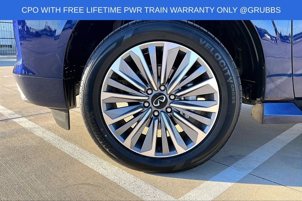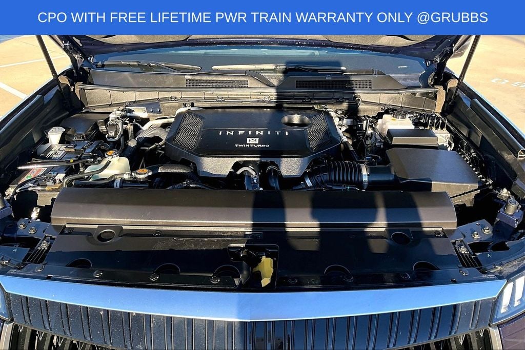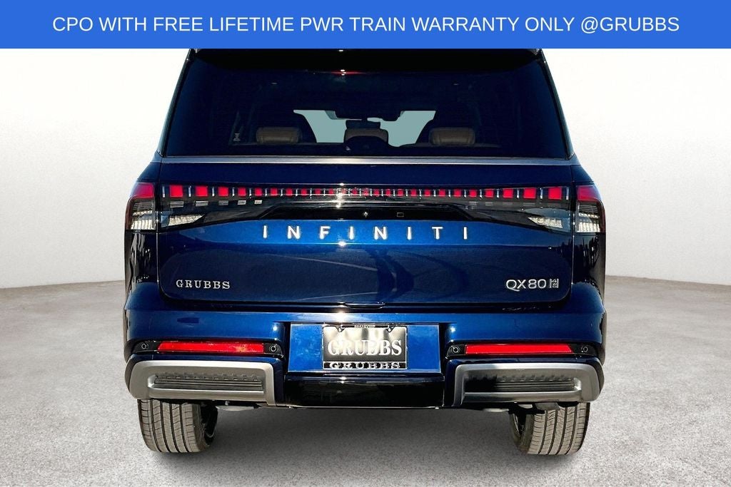 Grubbs INFINITI offers this Market Priced Pre-Owned 2025 INFINITI QX80 SENSORY in Grand Blue with a premium Sepia Brown interior. Fully inspected and all Eligible Vehicles are backed by our exclusive Grubbs Lifetime Powertrain Warranty, it comes loaded with features including INFINITI Certified Pre-Owned Certified, 3rd row seats: bench, 4-Wheel Disc Brakes, ABS brakes, Adaptive suspension, Air Conditioning, AM/FM radio: SiriusXM with 360L, Anti-whiplash front head restraints, Apple CarPlay/Android Auto, Audio memory, Auto High-beam Headlights, Auto tilt-away steering wheel, Auto-dimming door mirrors, Auto-dimming Rear-View mirror, Auto-leveling suspension, Automatic temperature control, Brake assist, Bumpers: body-color, Climate Controlled Front Bucket Seats w/Massage, Compass, Delay-off headlights, Driver door bin, Driver vanity mirror, Dual front impact airbags, Dual front side impact airbags, Electronic Stability Control, Emergency communication system: INFINITI InTouch, Four wheel independent suspension, Front anti-roll bar, Front Bucket Seats, Front Center Armrest, Front dual zone A/C, Front reading lights, Fully automatic headlights, Garage door transmitter: myQ Connected Garage, Genuine wood dashboard insert, Genuine wood door panel insert, Heads-Up Display, Heated door mirrors, Heated front seats, Heated rear seats, Heated steering wheel, HVAC memory, Illuminated entry, Knee airbag, Leather steering wheel, Low tire pressure warning, Memory seat, Navigation system: Google Built-in, Occupant sensing airbag, Outside temperature display, Overhead airbag, Overhead console, Panic alarm, Passenger door bin, Passenger vanity mirror, Power door mirrors, Power driver seat, Power Liftgate, Power moonroof, Power passenger seat, Power steering, Power windows, Radio data system, Radio: Klipsch Reference Premiere Audio System, Rain sensing wipers, Rear air conditioning, Rear anti-roll bar, Rear reading lights, Rear seat center armrest, Rear window defroster, Rear window wiper, Reclining 3rd row seat, Remote keyless entry, Security system, Semi-Aniline Premium Leather Seating Surfaces, Speed control, Speed-sensing steering, Split folding rear seat, Spoiler, Steering wheel memory, Steering wheel mounted audio controls, Tachometer, Telescoping steering wheel, Tilt steering wheel, Traction control, Trip computer, Turn signal indicator mirrors, Variably intermittent wipers, Ventilated front seats, Ventilated rear seats, and Wheels: 22 x 8 Cast Aluminum Alloy.