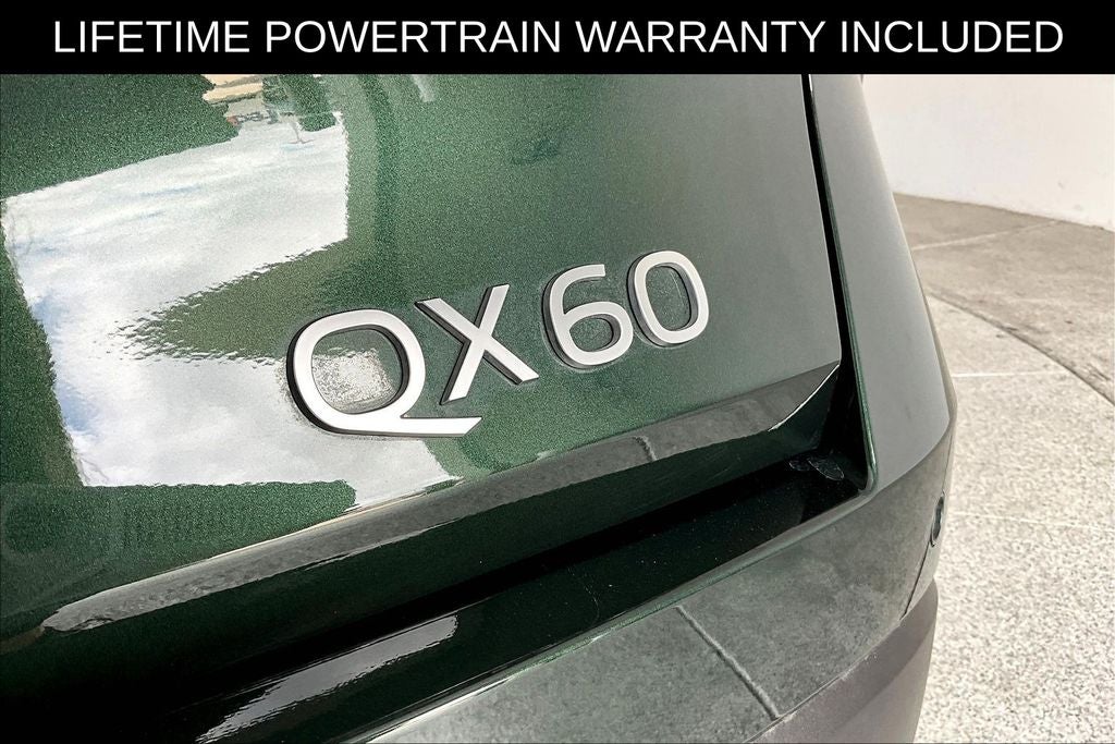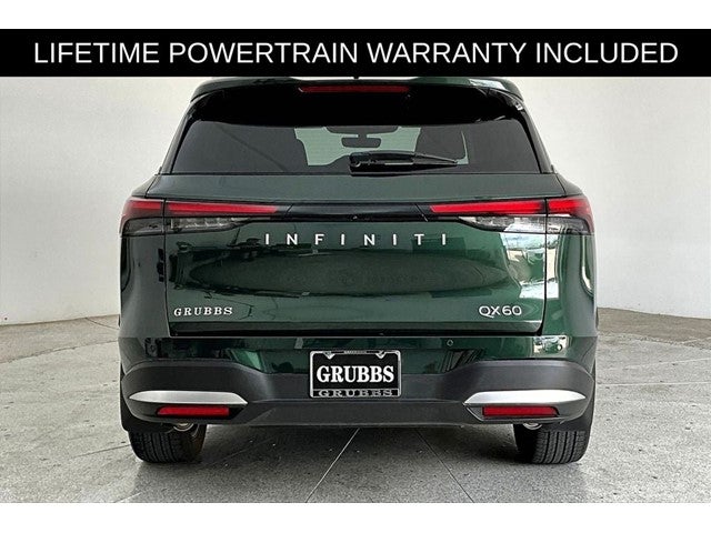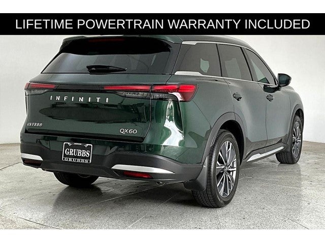 New Price! Certified. Grubbs INFINITI offers this Market Priced Pre-Owned 2026 INFINITI QX60 LUXE in Deep Emerald with a premium Graphite interior. Fully inspected and all Eligible Vehicles are backed by our exclusive Grubbs Lifetime Powertrain Warranty, it comes loaded with features including Cargo Package (Cargo Blocks, Cargo Mat, Cargo Net, Clear Rear Bumper Film, and Medic Kit), Family Package (Seatback Organizer, Soft Sided Cargo Cooler, Tablet Holder, and USB Charging Cable Set), INFINITI Certified Pre-Owned Certified, 16 Speakers, 3rd row seats: bench, 4-Wheel Disc Brakes, ABS brakes, Air Conditioning, Alloy wheels, AM/FM radio: SiriusXM with 360L, Anti-whiplash front head restraints, Apple CarPlay/Android Auto, Auto High-beam Headlights, Auto tilt-away steering wheel, Auto-dimming door mirrors, Auto-dimming Rear-View mirror, Automatic temperature control, Bose Performance Series 17-Speaker Sound System, Brake assist, Bumpers: body-color, Climate Controlled Front Bucket Seats, Delay-off headlights, Driver door bin, Driver vanity mirror, Dual front impact airbags, Dual front side impact airbags, Electronic Stability Control, Emergency communication system: INFINITI InTouch, Four wheel independent suspension, Front anti-roll bar, Front Bucket Seats, Front Center Armrest, Front dual zone A/C, Front reading lights, Fully automatic headlights, Garage door transmitter: HomeLink, Heated door mirrors, Heated front seats, Heated rear seats, Heated steering wheel, Illuminated entry, Knee airbag, Leather Shift Knob, Leather steering wheel, Low tire pressure warning, Memory seat, Navigation system: Google Built-in, Occupant sensing airbag, Outside temperature display, Overhead airbag, Overhead console, Panic alarm, Passenger door bin, Passenger vanity mirror, Power door mirrors, Power driver seat, Power Liftgate, Power moonroof: Panoramic, Power passenger seat, Power steering, Power windows, Premium Paint, Radio data system, Radio: Klipsch Premium Audio System, Rain sensing wipers, Rear air conditioning, Rear anti-roll bar, Rear reading lights, Rear seat center armrest, Rear side impact airbag, Rear window defroster, Rear window wiper, Reclining 3rd row seat, Remote keyless entry, Security system, Speed control, Speed-sensing steering, Speed-Sensitive Wipers, Split folding rear seat, Spoiler, Steering wheel memory, Steering wheel mounted audio controls, Tachometer, Tailorfit-Appointed Seating Surfaces, Telescoping steering wheel, Tilt steering wheel, Traction control, Trip computer, Turn signal indicator mirrors, Variably intermittent wipers, Ventilated front seats, and Wheels: 20 x 8J Machined Aluminum Alloy. 2026 INFINITI QX60 LUXE 4D Sport Utility FWD 2.0L I4 PDI Turbocharged DOHC 16V 268hp 9-Speed Automatic Deep Emerald Upgraded Wheel Package.